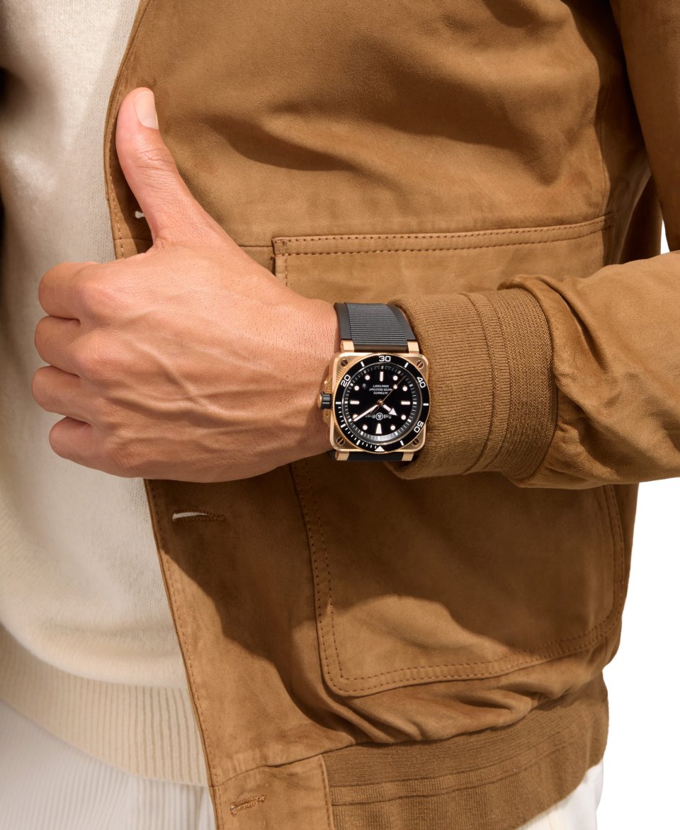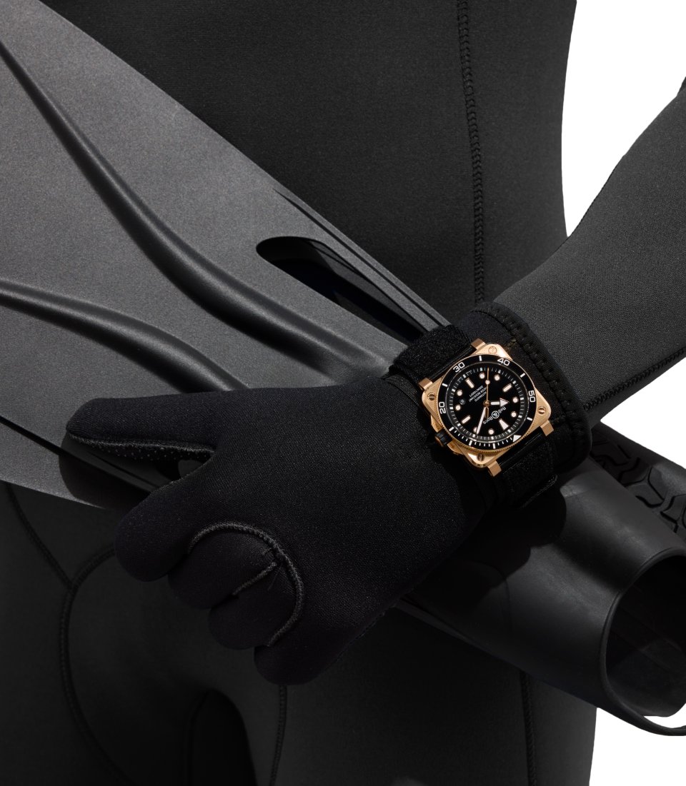 ベル&ロスにおいて、ダイバーズウォッチは必ずしも丸型である必要はありません。この唯一無二のデザインによって、ダイバーコレクションは強い個性を獲得し、瞬時に認識される現代性を確立しています。 新作BR-03 ダイバー ブラック ブロンズは、洗練を極めたデザインバランスを追求しています。艶やかなブラックのラッカーダイアルは、ゴールドトーンを帯びたブロンズケースとの間に鮮烈なコントラストを生み出します。