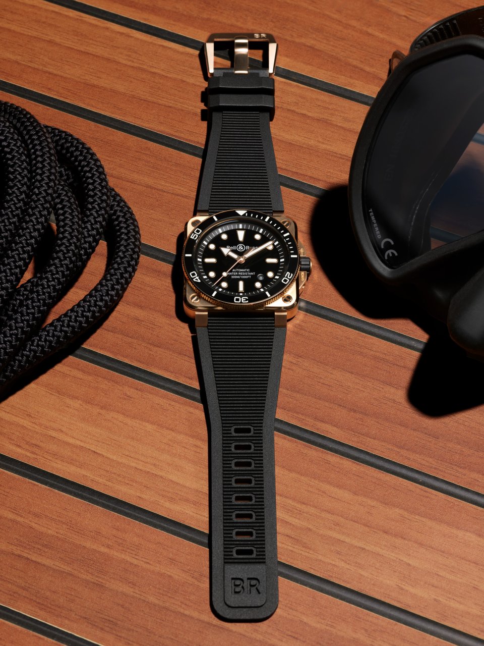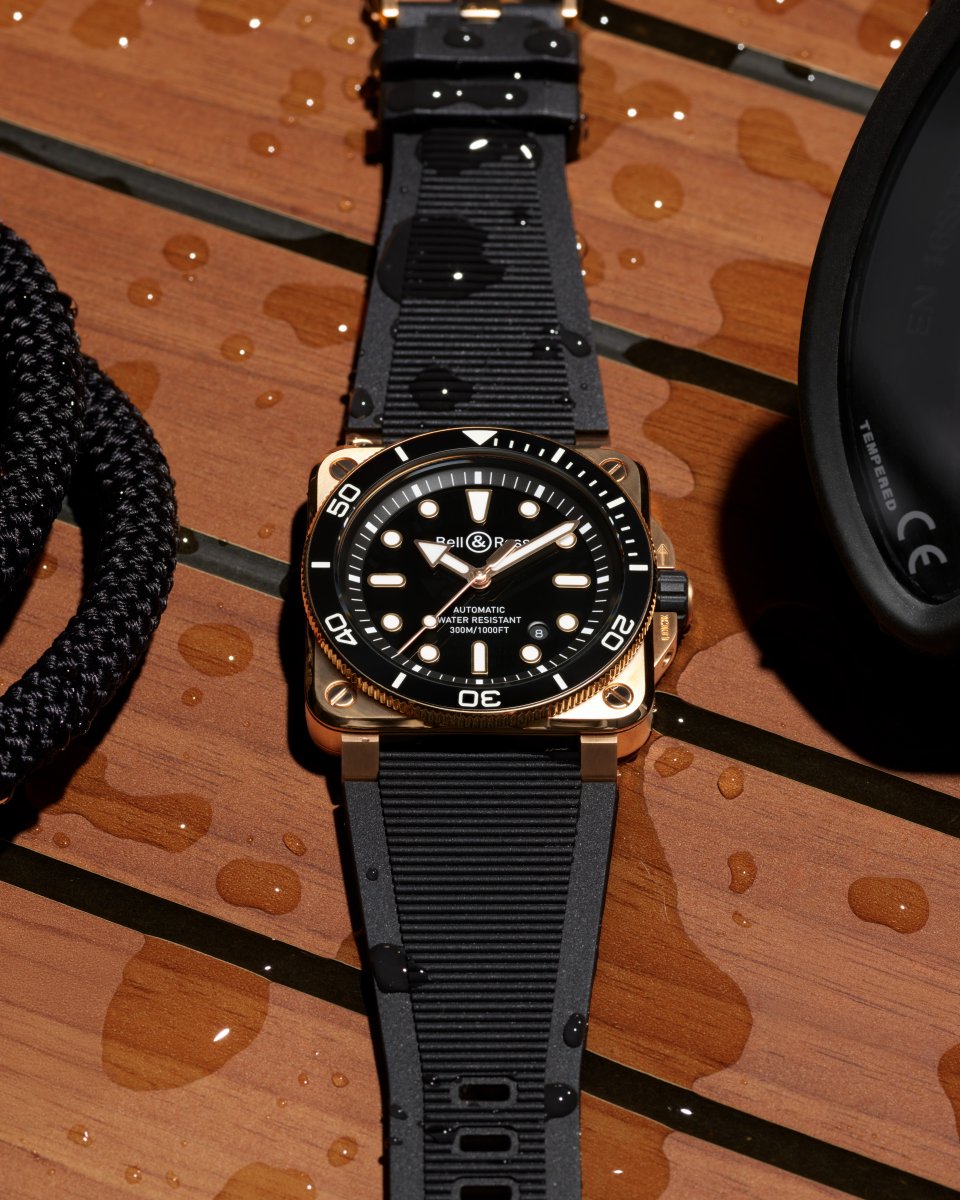 BR-03 ダイバー ブラック ブロンズは、リヴィエラの洗練された世界観とラグジュアリーヨットからインスピレーションを得ています。地中海の陽光に包まれた海へのエスケープや、選び抜かれたボートのチークデッキを想起させるとともに、アール・ド・ヴィーヴルを体現する肩肘張らない贅沢さを表現しています。