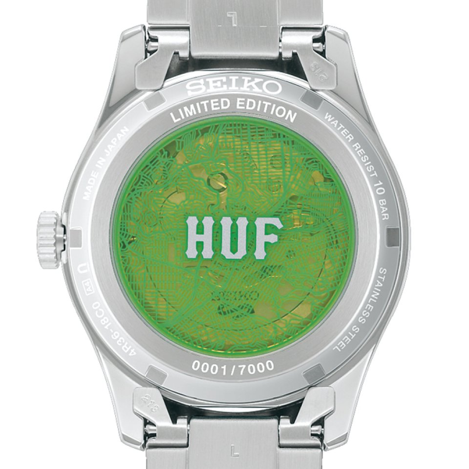 シースルーバック仕様の裏ぶたは、ダイヤルと同じく「HUFグリーン」を採用し、サンフランシスコのシティパターンの線画を入れました。数量限定モデルの証として「LIMITED EDITION」とシリアルナンバーが記されています。さらに、りゅうずの先端にも、「HUF」のロゴをあしらっています。
