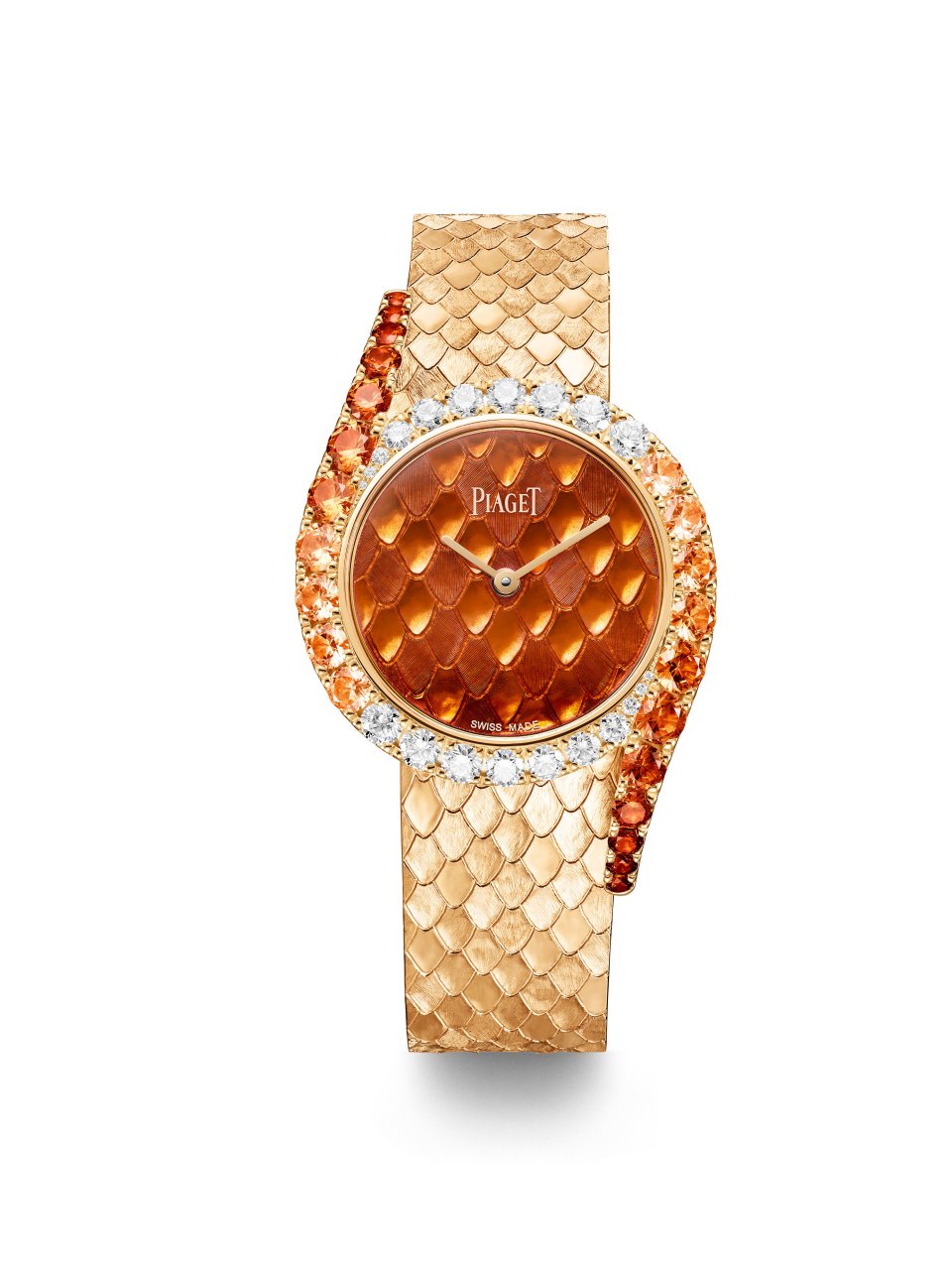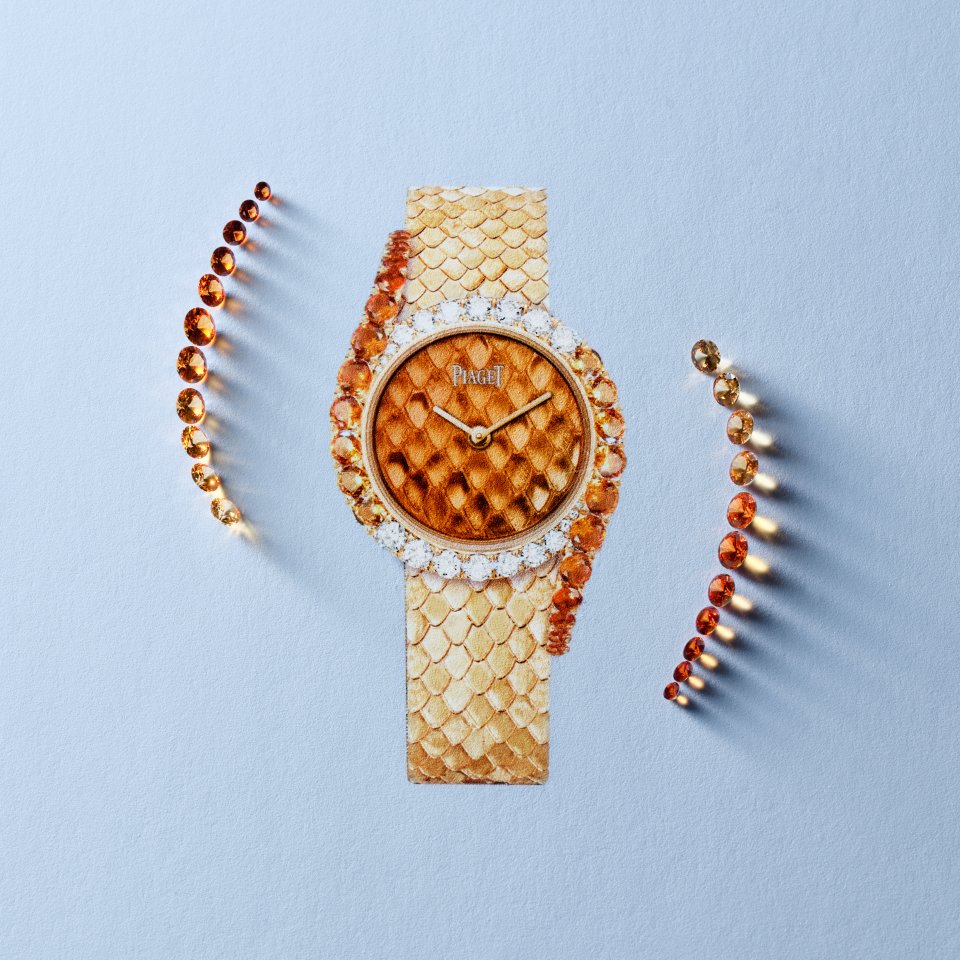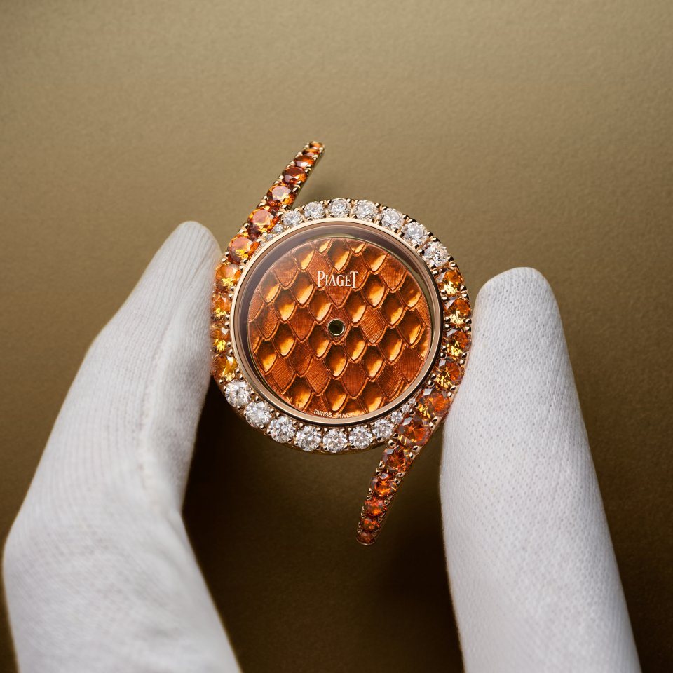 2026年春、ピアジェは2つの新しいライムライト ガラ モデルを発表します。脚光を浴びたがっているような、炎の色調が映えるタイムピースです。スネークパターンのゴールドエングレービングに鮮やかなオレンジ色の「グラン・フ」エナメルを施した文字盤。贅沢にあしらったダイヤモンドがサーキュラーケースを囲み、スネークパターンのゴールドエングレービングを施したブレスレットに向かって、スペサタイトガーネットの濃い夕焼けの陰影が曲線を描きながら流れています。