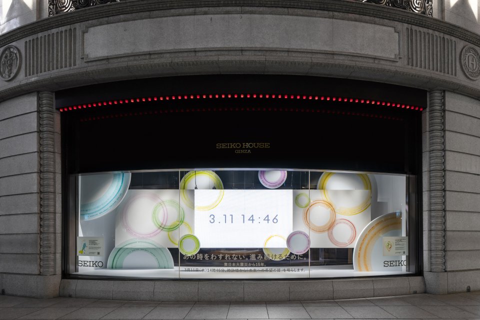 銀座4丁目SEIKO HOUSEのショーウインドウで音と”わ“がひろがる、15個の“わ”のディスプレイを実施~ 3月11日(水)14時46分、時計塔から「未来への希望の鐘」が鳴り響く