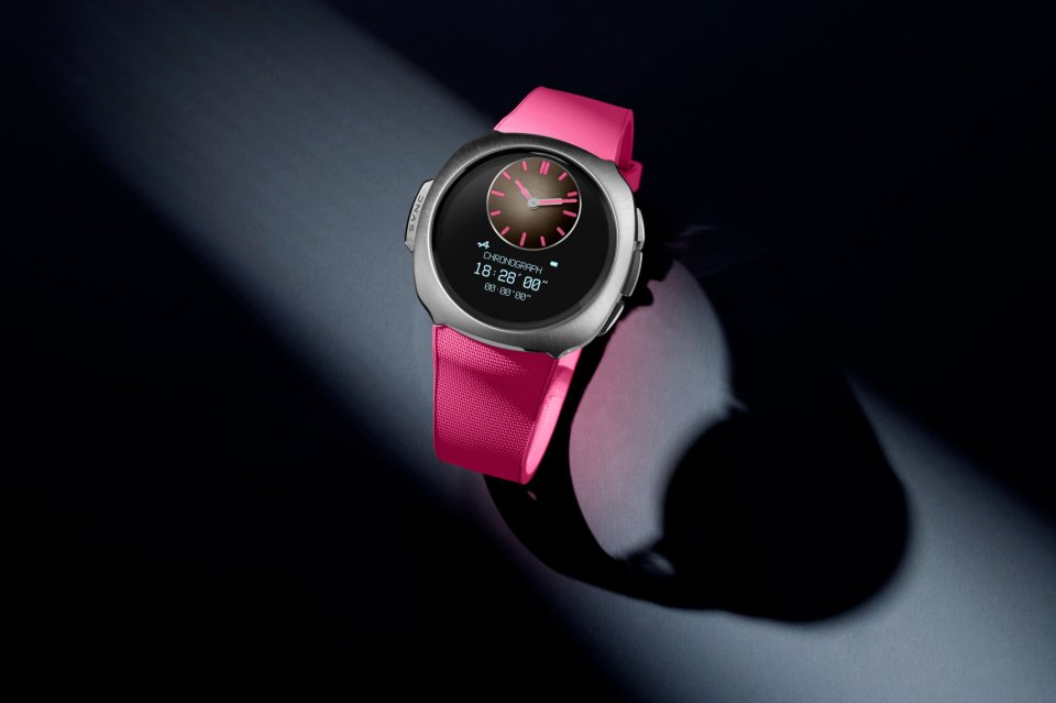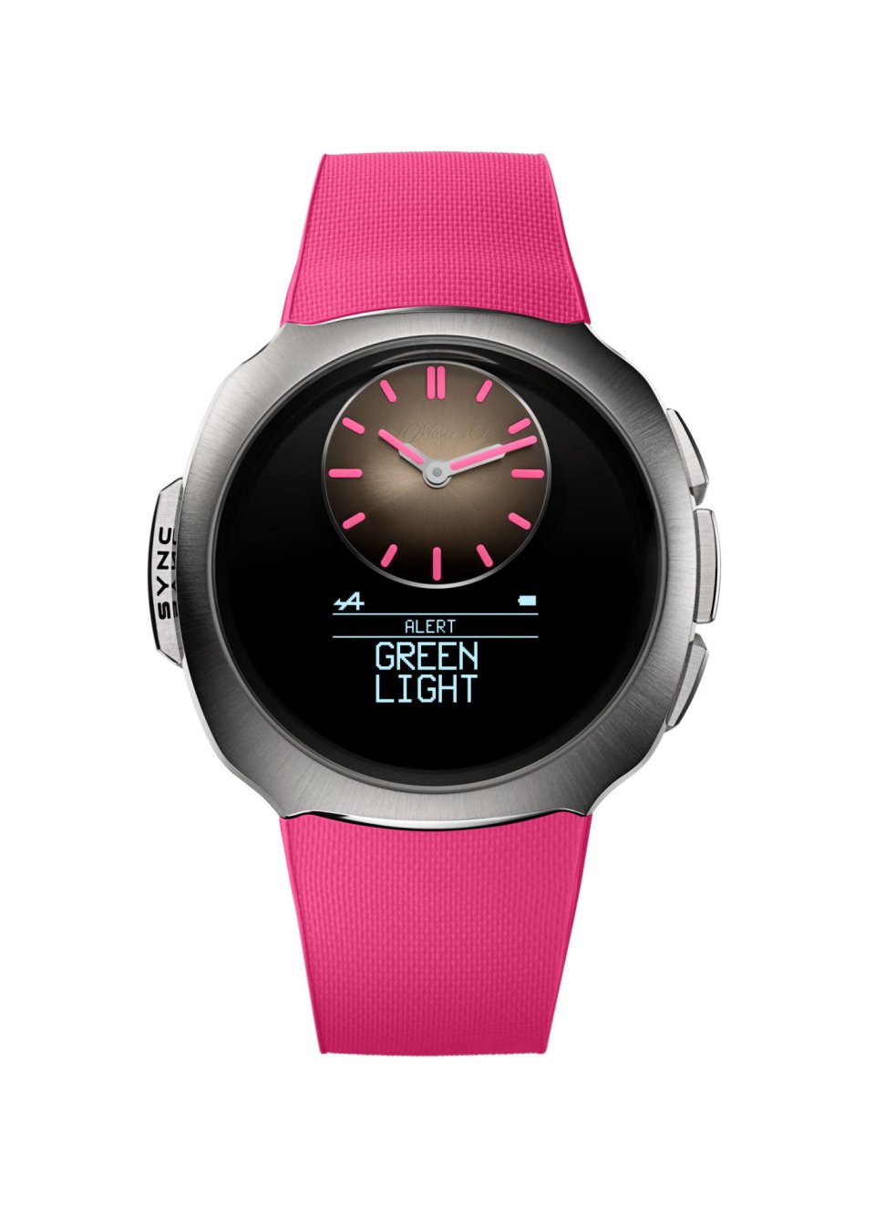 ・4 時位置にねじ込み式リュウズ、「M」の刻印入り、ピンクのラバーリング付き