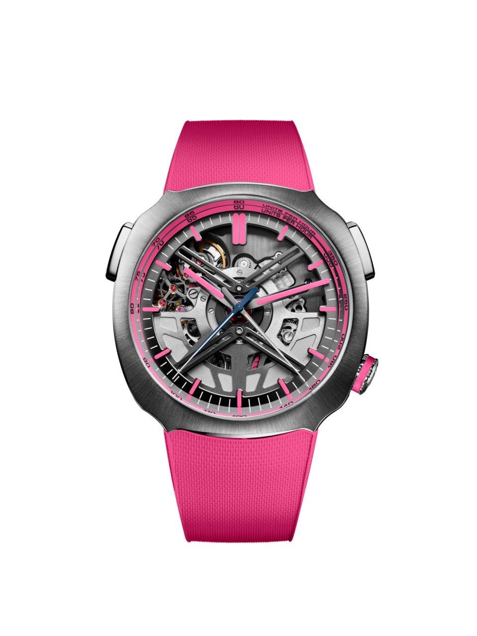 [特長]ステンレススチール製モデル、スケルトン ダイアル、ピンクの一体型ラバーストラップ