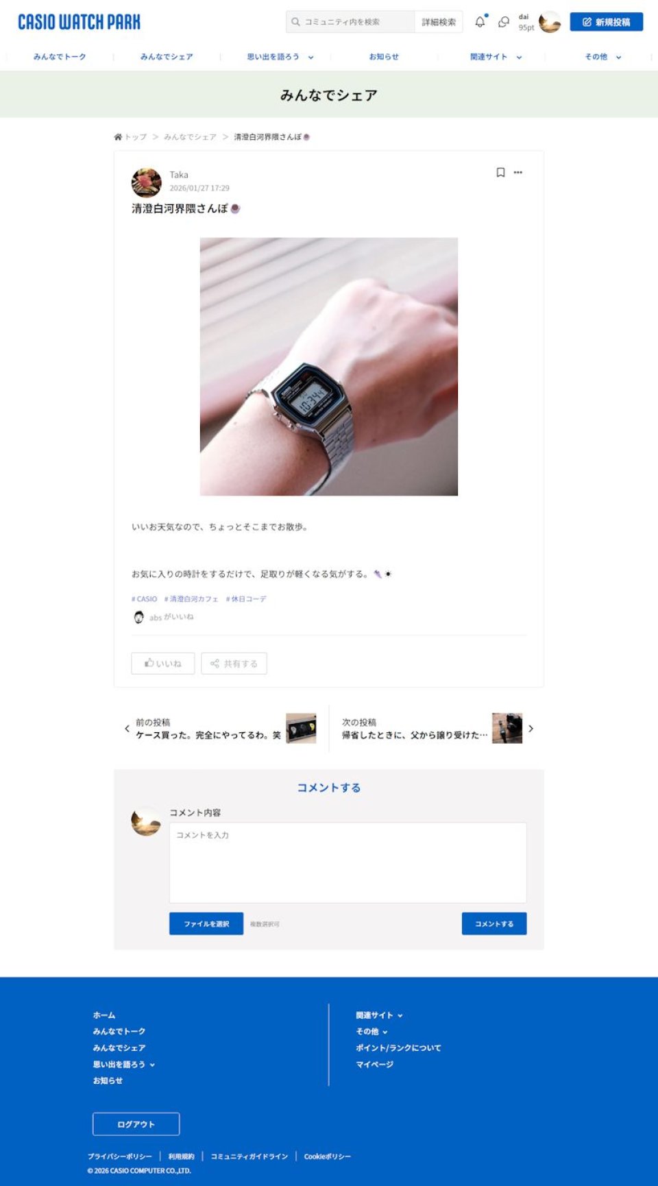 「トーク投稿」は写真添付を必須とせず、「カシオの腕時計との初めての出会い」や「時計にまつわるエピソード」など、幅広いテーマで気軽に投稿する形式です。また、他のユーザーの投稿へのコメント機能といったユーザー同士のつながりを促進する仕組みも備えています。