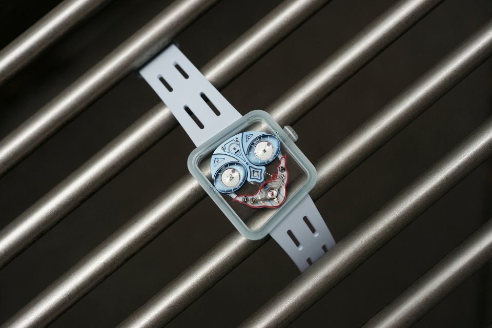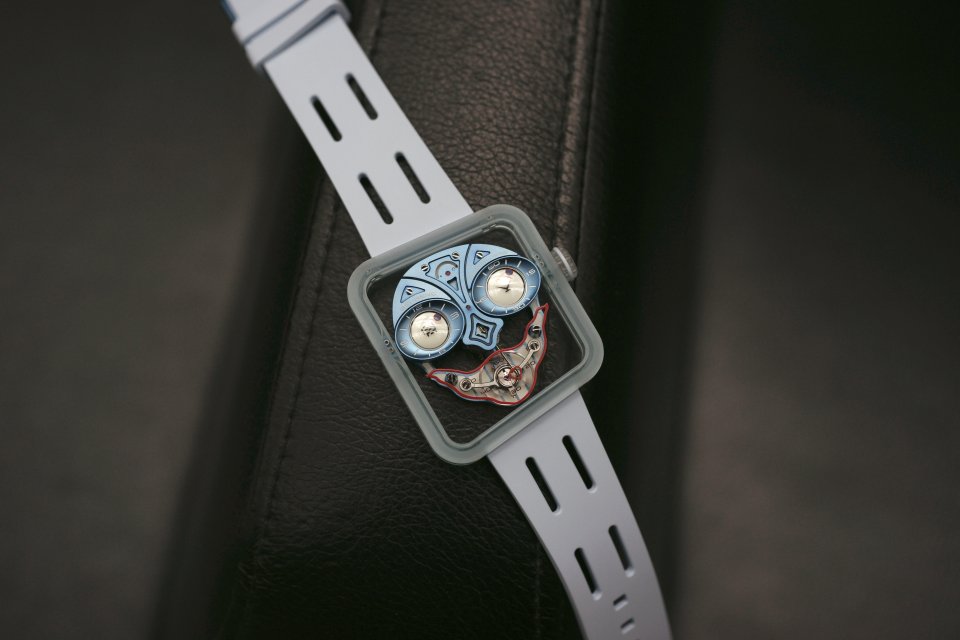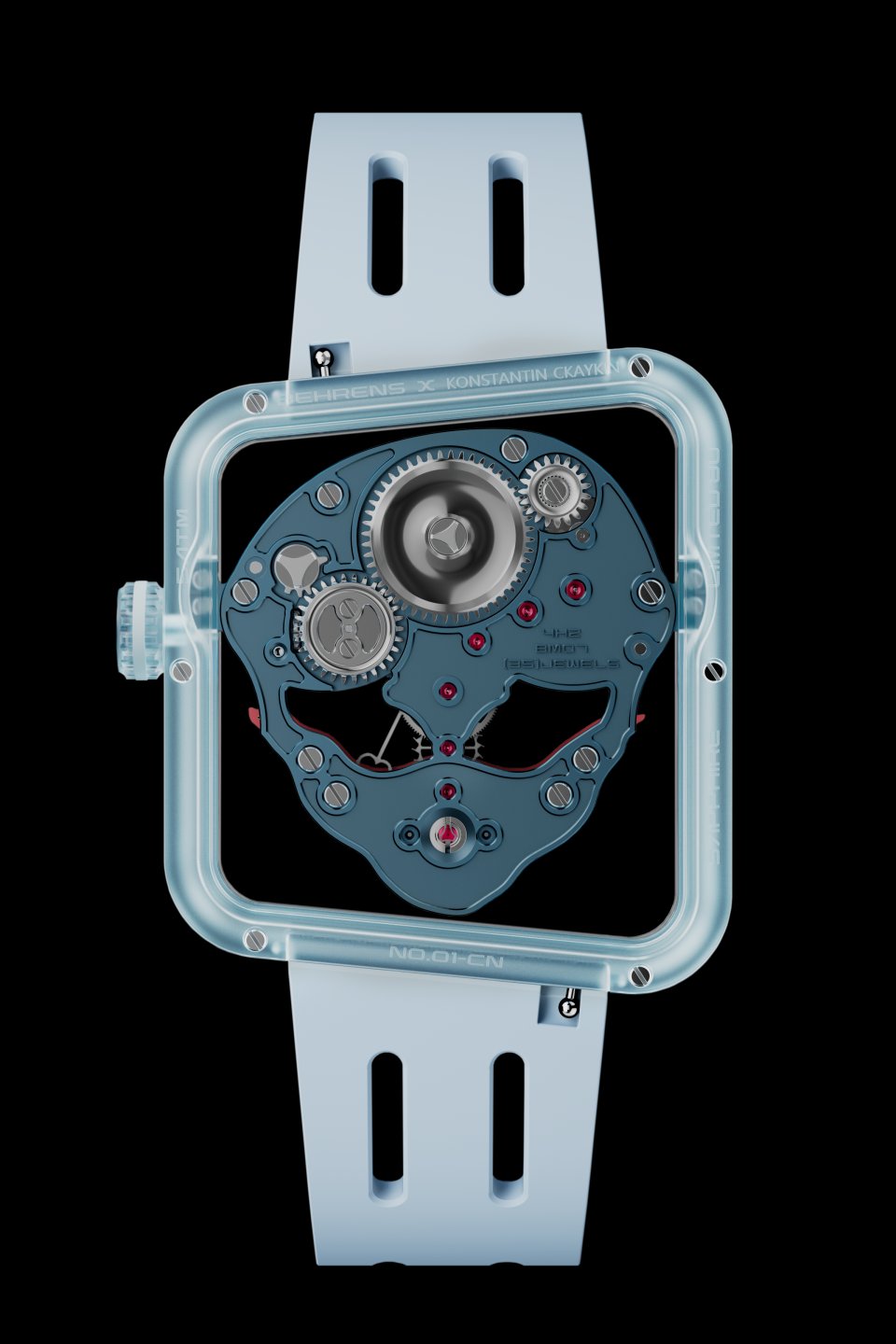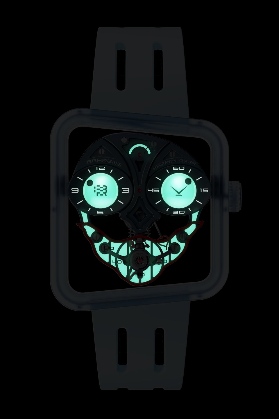 秒針は前作同様ベーレンスが特許取得済みの石臼式機械技術を採用、ハート型の外周に沿うように独特の軌道を描きます。左右の眼はそれぞれ「時」と「分」を表示し、額にはパワーリザーブ表示が追加されました。ベーレンスでは素材開発にも注力しており、この新しい限定コレクションでは3 種類の異なる素材を採用しています。