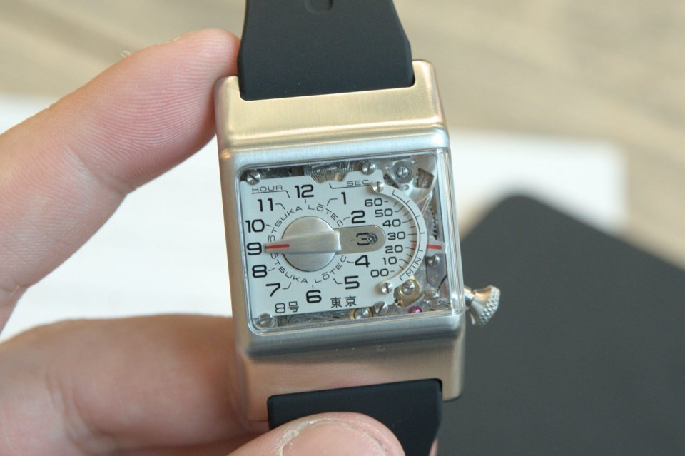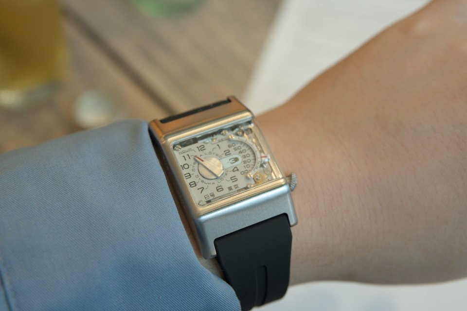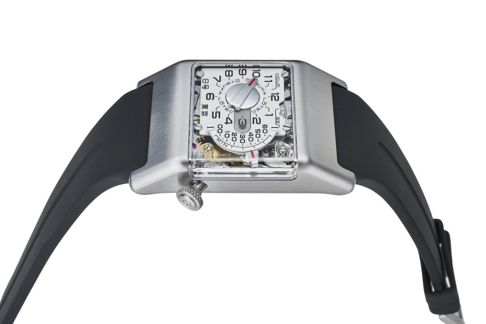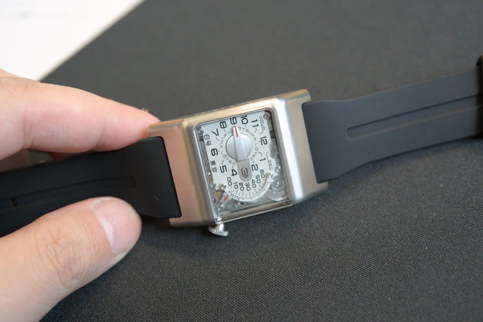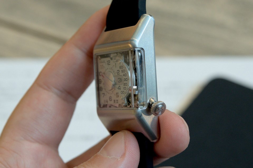 「9号」との連続性と共にテープデッキのような印象を受ける立体的に回りこむ風防、この構造によりレトログラードミニッツをはじめとした複雑なモジュール構造を直接眺めることができます。