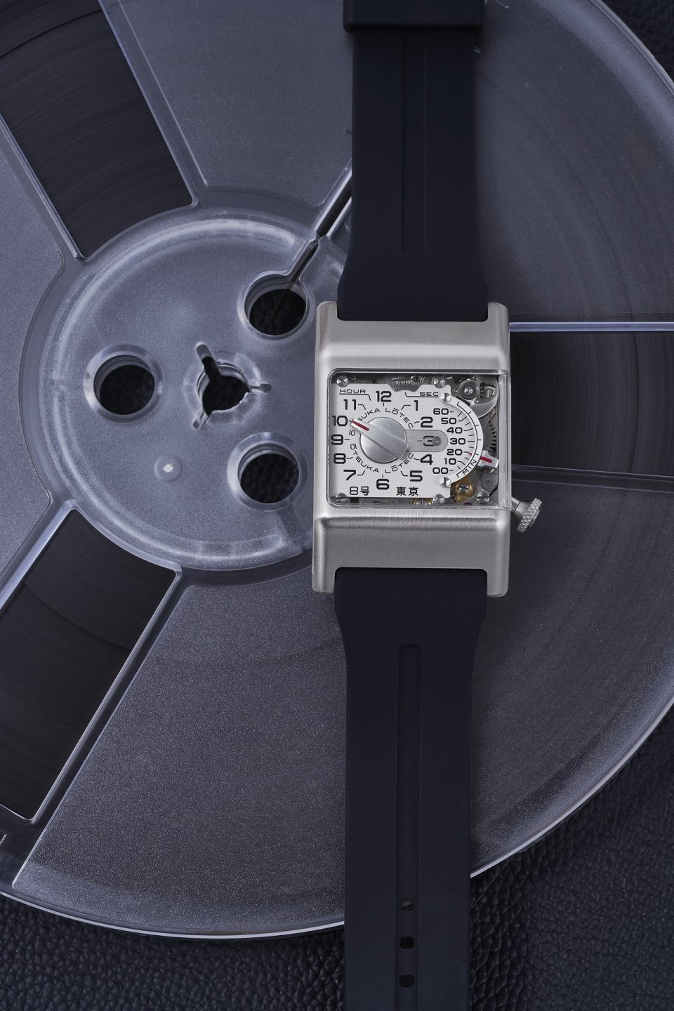 透明の開口部から複雑な機構が見えるさまはテープデッキの様な印象も受けます。