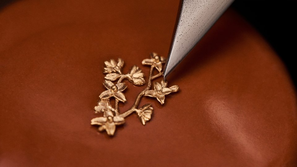イエローゴールドに精巧な彫刻を施した枝ぶりと花は、生命感溢れる表情と細部への比類なきこだわりを感じさせます。また、花と枝はオートマタの可動パーツであるため、マスター・エングレーバーは、花に使用するゴールドの重量と適切なサイズも慎重に検討する必要がありました。