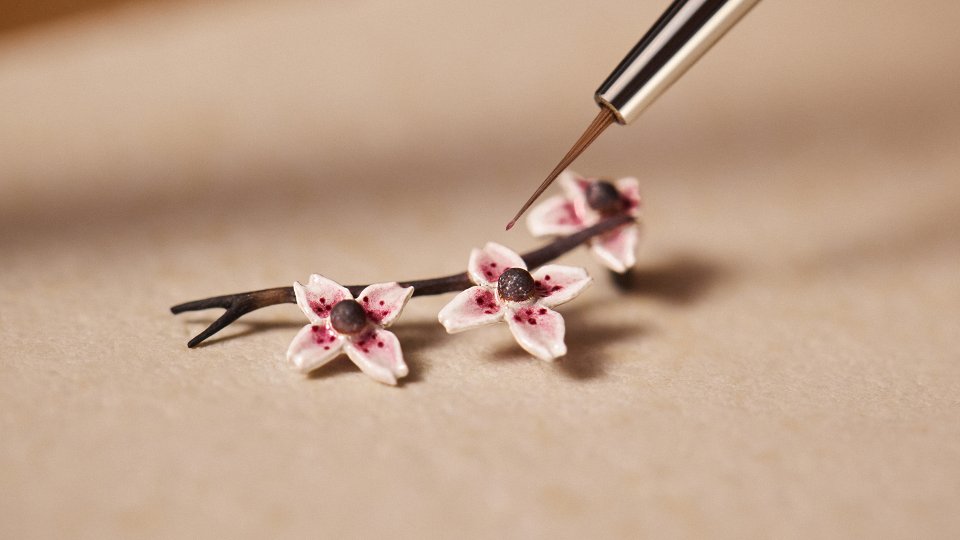 最後に、ダイアル上のミニチュアの立体的な要素にもエナメルが施され、下地のエングレービングにさらなる生命感と奥行き、そして美しさを加えています。ルイ・ヴィトンのモノグラム・フラワー モチーフをさりげなく取入れて彫刻された9つの桜の花は、淡いピンクからピンク、レッドへと移ろう繊細なグラデーションで色付けされ、生き生きとした透明感と共に、写実的でありながらも優美な佇まいで表現。