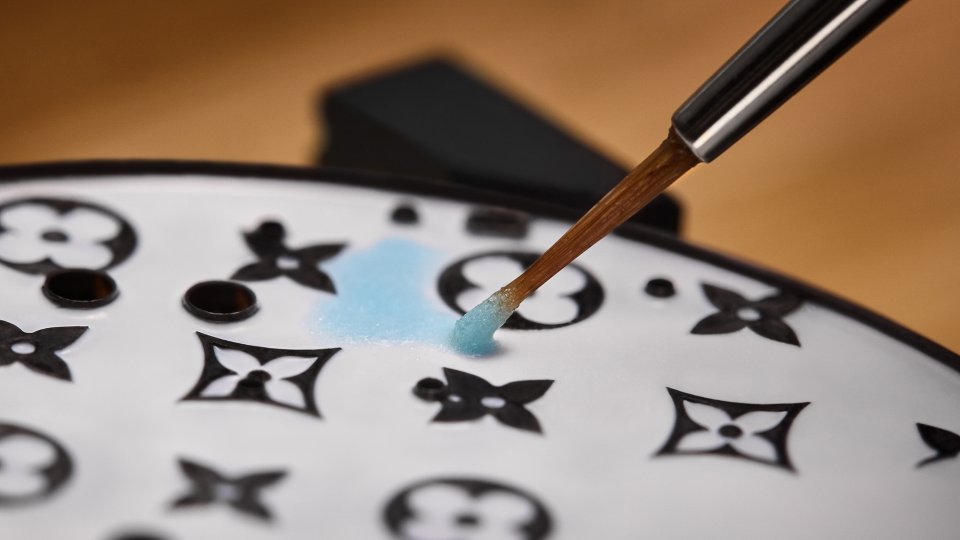 ダイアル上の最も崇高で魅惑的な意匠の1つが空です。ピンクとブルーのグラデーションにイエローのエナメルが重なり、春の夜明けの情景を想わせます。ルイ・ヴィトンのモノグラム・フラワーが空にアクセントを添え、わずかに起伏を持たせた仕上げによって立体感を生み出しています。