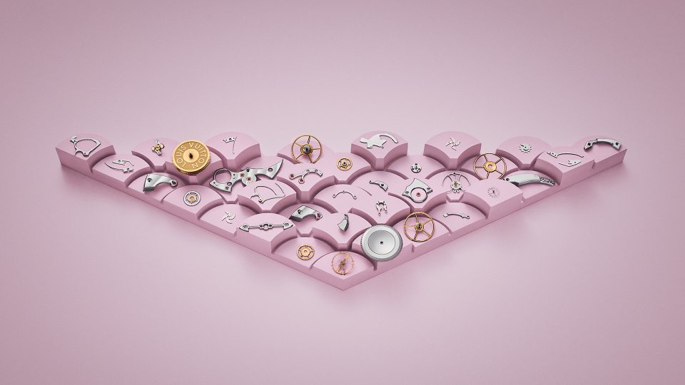 こうした部品の多くは目に触れないにも関わらず、「ラ・ファブリク・デュ・タン ルイ・ヴィトン」のウォッチメイカーたちが1つ1つの部品を手作業で製作・成形しており、類い稀な職人技による仕上げが施された唯一無二のムーブメントを創り上げています。例えば、700ものインナーアングルに施された面取りは、光と反射の美しい表情を生み出すと同時に、職人の才能と忍耐を物語っています。