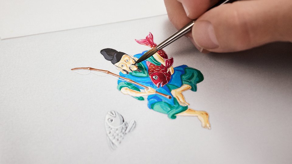 えびす様のアップリケと立体的な造形も同様に、難度の高い課題です。ここでのエナメル彩色はとりわけ繊細で、すでに色付けされた部分を損傷させるリスクが常につきまとうため、ミニアチュール・エナメルは精密に施され、表情や衣のドレープに細心の注意が払われました。
