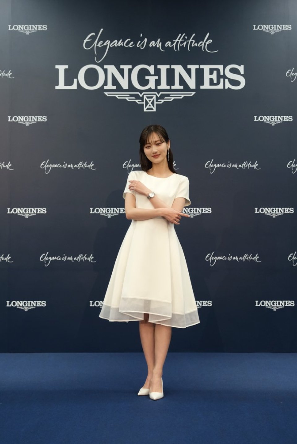 58粒のダイアモンドが煌めく、ロンジンの「エレガンス」を象徴する人気ジュエリーウォッチ「ロンジン プリマルナ」を着用して来場。