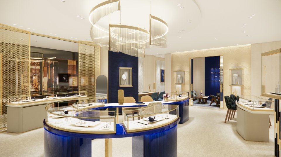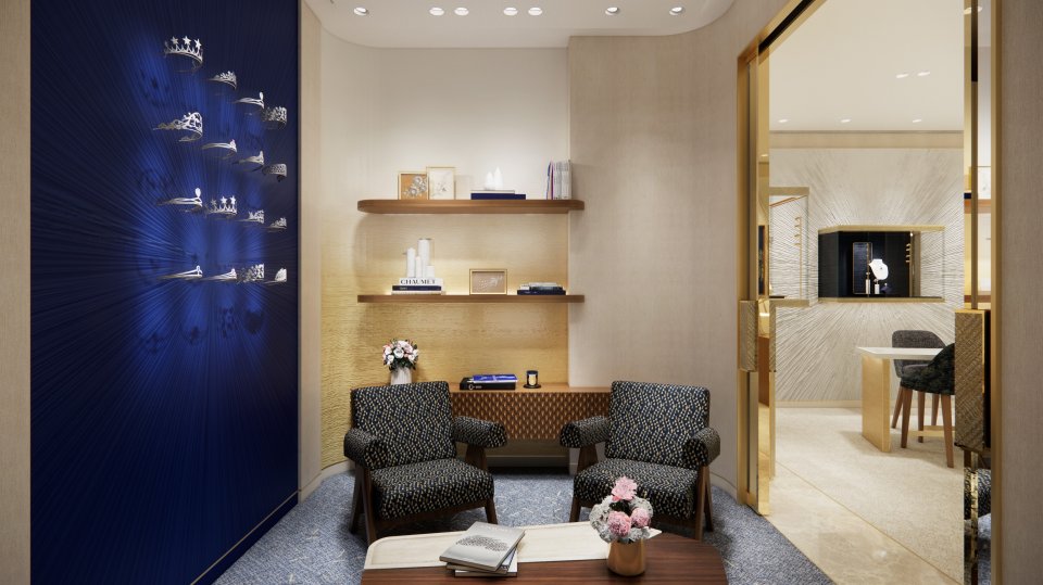 印象的なサファイアブルーのファサードがブティック全体を優雅に、そして力強く包み込み、解放感に満ちた輝く空間を演出します。ショーメのアイデンティティを象徴するこのブルーは、メゾンが紡ぐ物語を表現しています。光の柔らかな触れ合いによって、繊細な輝きが空間を満たし永続的な美しさを湛えます。店内には個室も兼ね備え、ゆったりとくつろぎながら商品をお選びいただくこともできます。