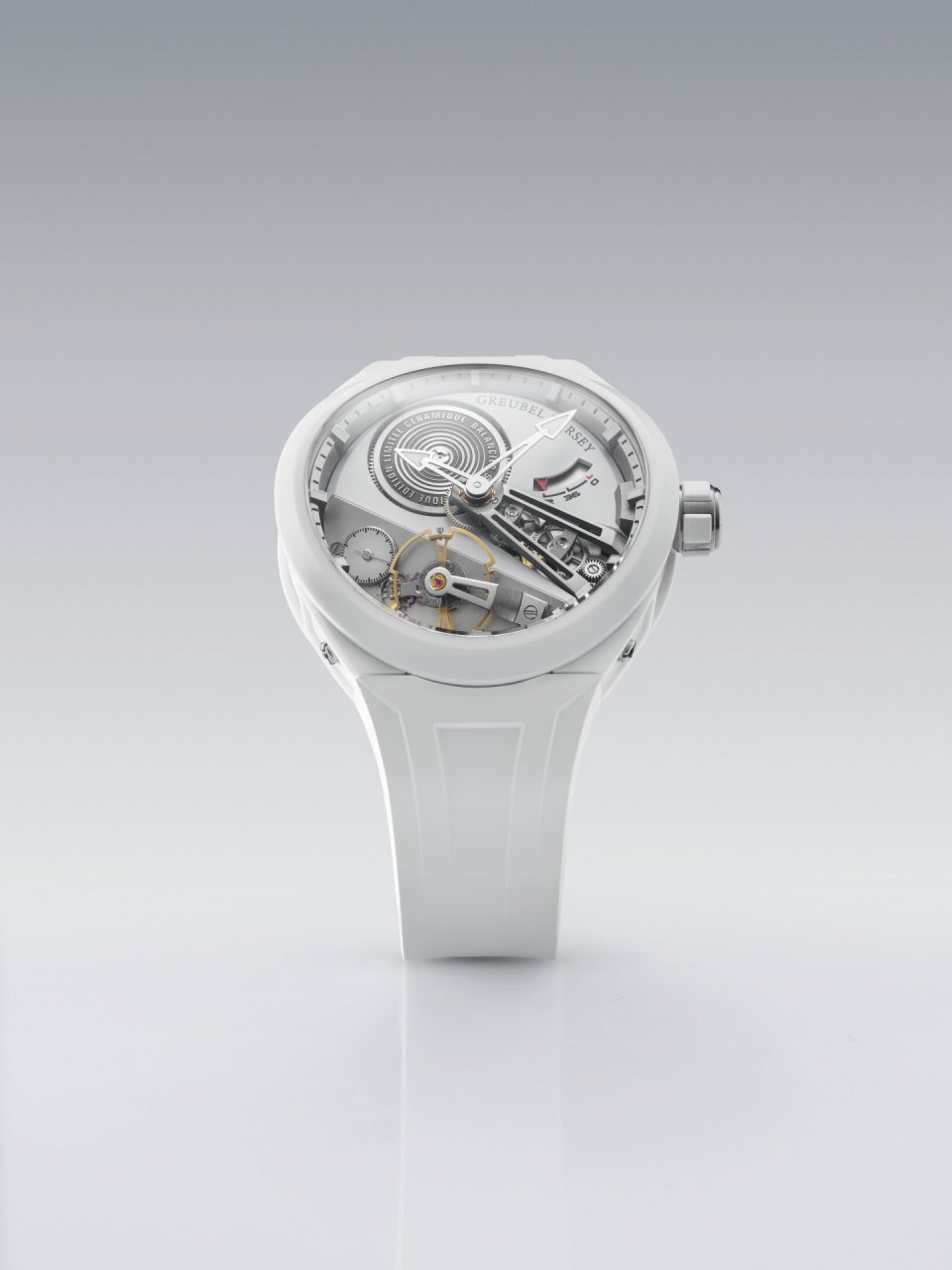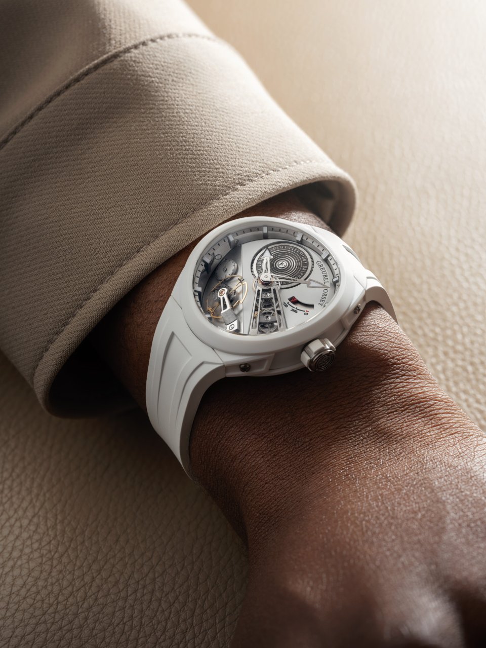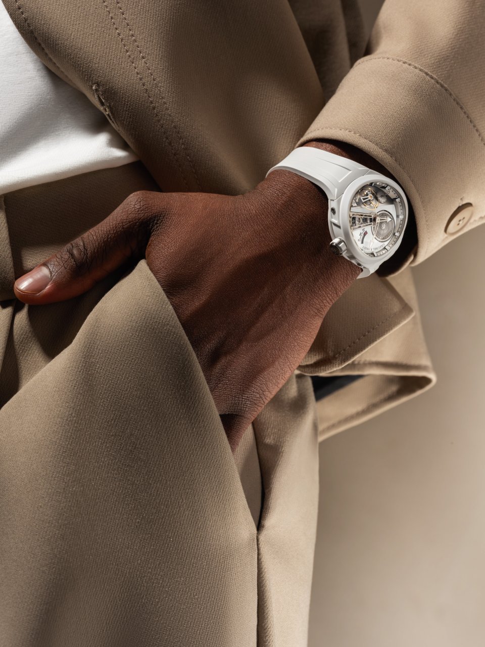 一方で、ホワイトセラミック製のエディションにおいては、真逆のアプローチが採用されています。モノクロームのライトトーンで彩られたケースによって、タイムビースの開放性と精緻さがハイライトされ、光と陰の戲れからムーブメントが立ち現れるような印象をもたらします。構造によってビジュアル言語が形づくられ、さらにテクニカルでグラフィックな表現力が息づきます。ホワイトセラミックを用いた構造によって、コンヴェクスの持ち味であるピュアなジオメトリーがハイライトされながらも、メカニカル面における深度と視認性はそのままに保たれます。