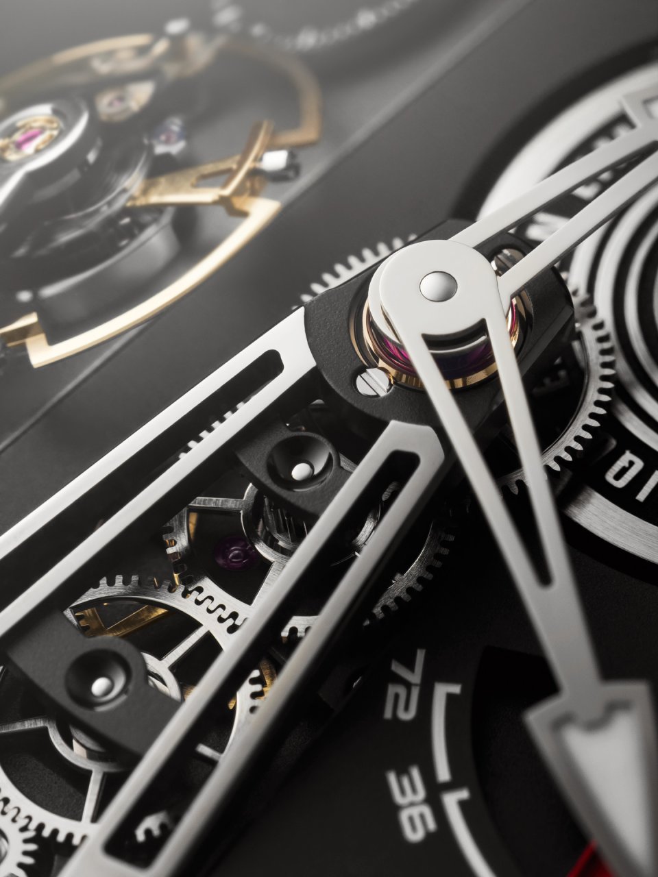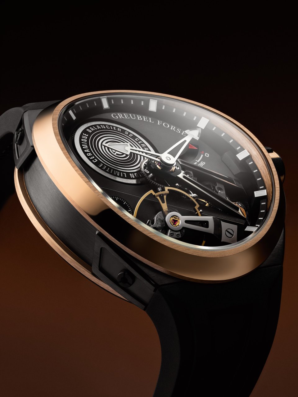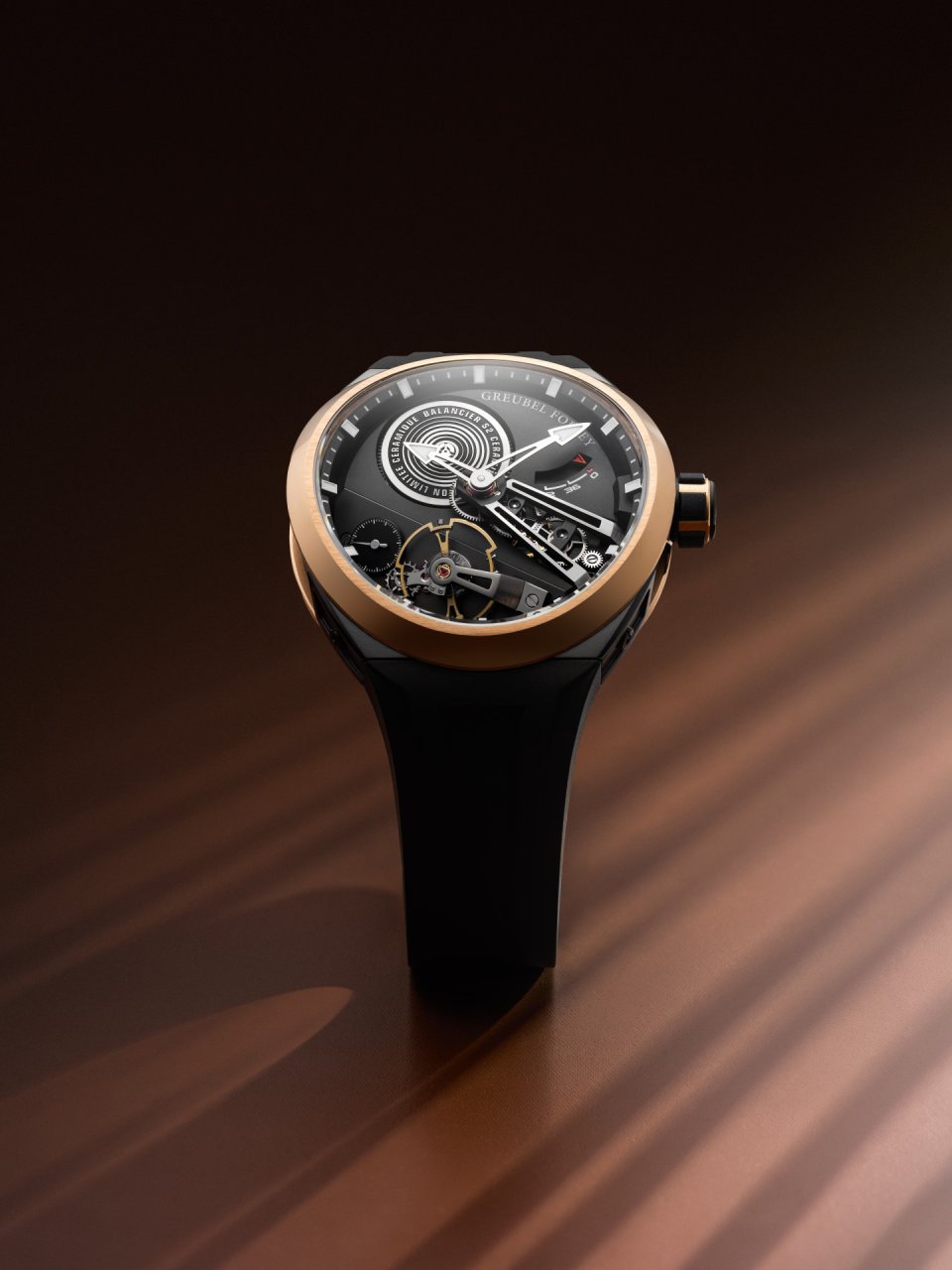 プラック加工されたムーブメントバーツとセラミックケースによってアーキテクチャが美しくフレーミングされ、レッドゴールドを使用したベゼルとケースバックによってあたたかみと視覚的な重厚感が演出されています。マット仕上げとボリッシュ仕上げに生み出される相互作用によって、ムーブメントの立体感が巧みに引き立てられ、コンヴェクスケース独特の彫刻的なたたずまいをアビールします。