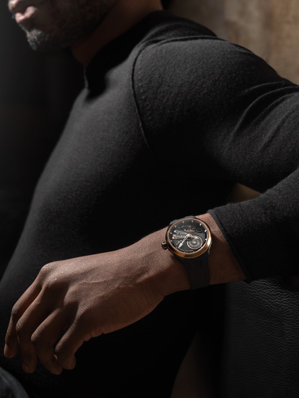 手首のカーブラインに美しくフィットするコンヴェックスのアーキテクチャによって、立体的なムーブメントのバランスが確保され、視認性と快適性を絹羅した日々の着用が保証されます。キャリバーを内包するというよりもアーキテクチャを外側へ解放することを志向するケースによって、タイムピースのフォルムとメカニズム間の対話がハイライトされています。