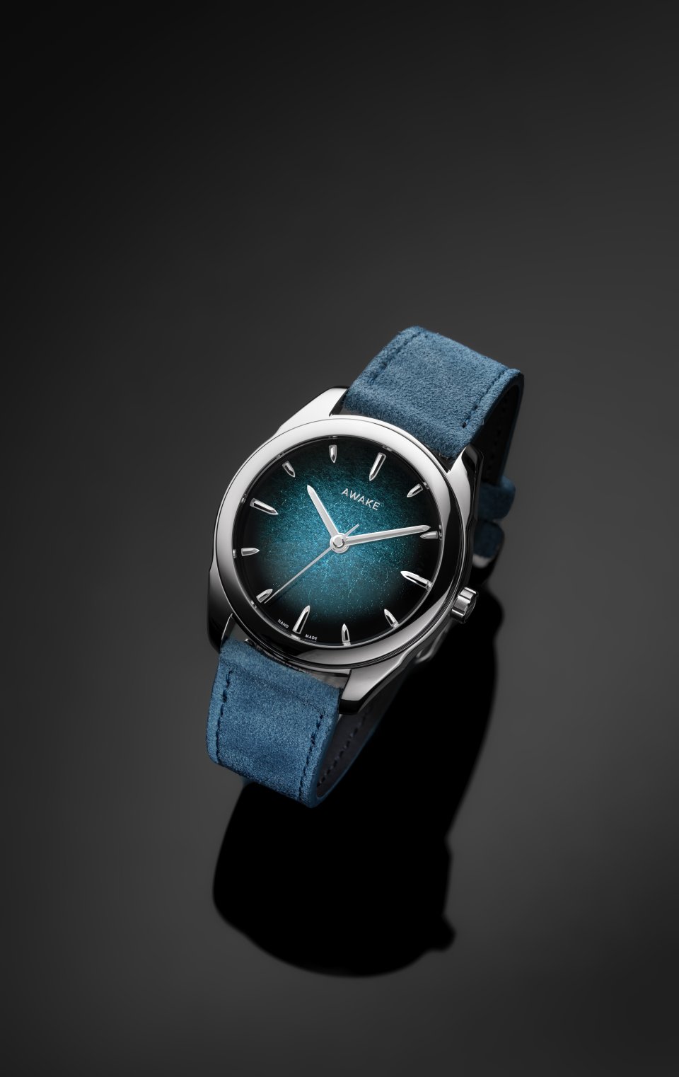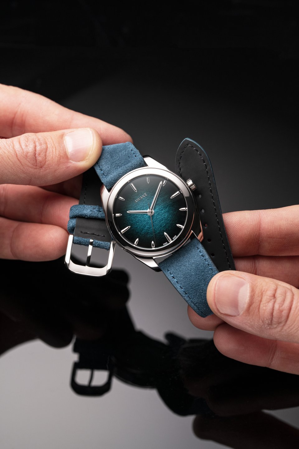 アトランティス・ブルーのダイヤルには、AWAKE独自の発光シグネチャーが採用されています。これは日本の美意識である明暗のコントラスト(キアロスクーロ)から着想を得たもので、光と影の対比によって物の神秘性を保つ表現です。
