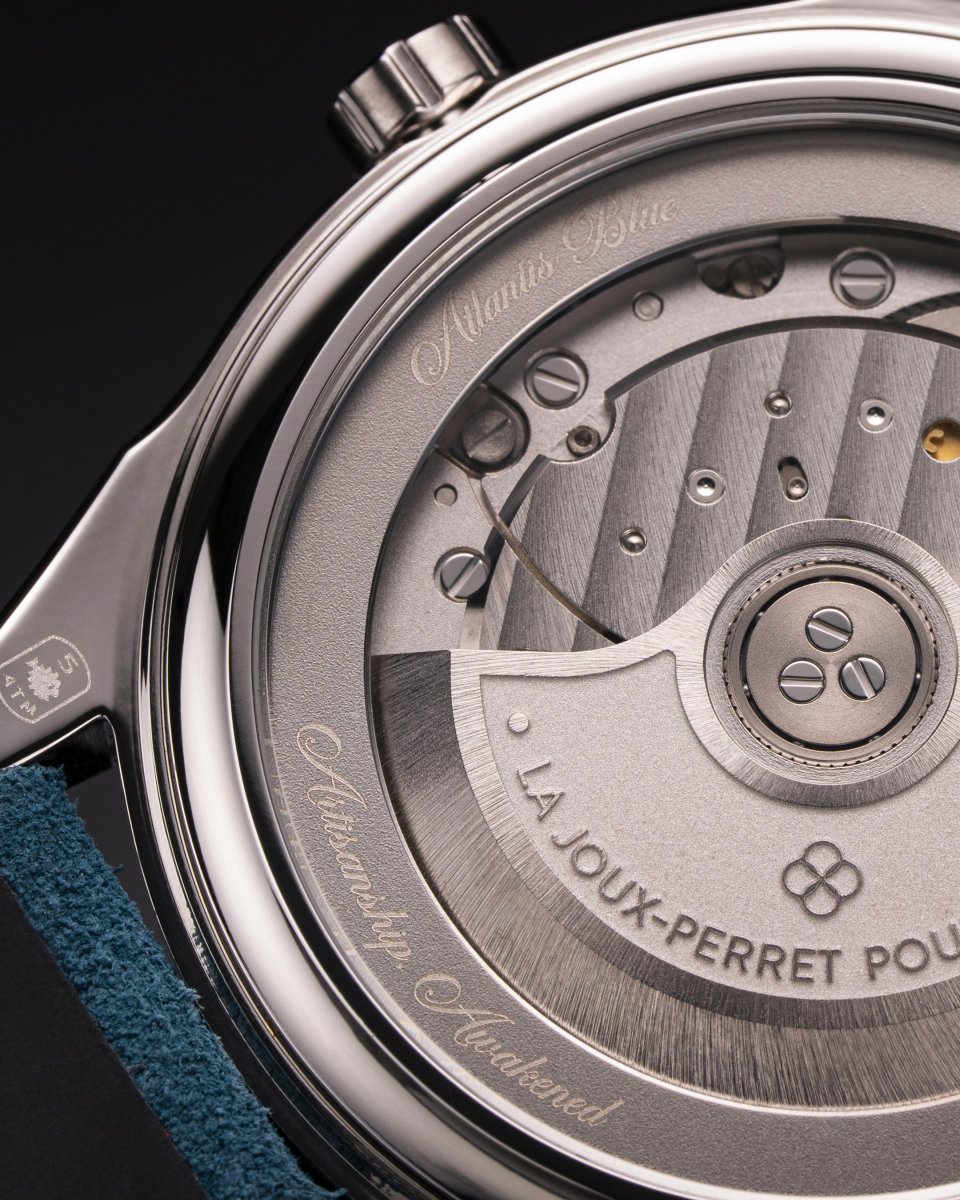 アトランティス・ブルーには、スイスのムーブメントメーカーLa Joux-Perret が開発したキャリバーG101が搭載されています。サファイアクリスタル越しに見ることができるこのムーブメントは、高い信頼性と精度を備え、丁寧に施された仕上げと約68時間のパワーリザーブが特徴です。