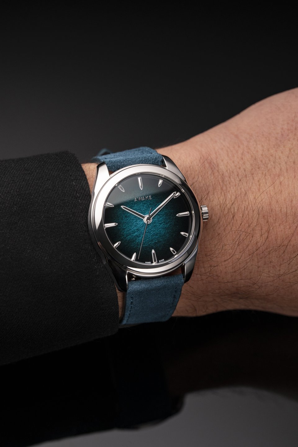 アトランティス・ブルーのダイヤルが持つ色彩のニュアンスと豊かさをさらに引き立てるため、本モデルには「ピーコックブルー」のスエードカーフストラップが採用されています。