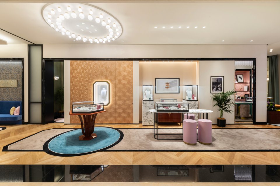 ブティックのデザインは、ブシュロンにとって特別な場所である、パリ・ヴァンドーム広場本店の建築様式からインスピレーションを得ています。ファサードは、メゾンを象徴するグリーンのメタルプリズムによって構成され、光を受けてダイヤモンドのファセットのように輝きを放ち、鏡のように多彩な表情を生み出します。店内は、ブシュロンの美学を象徴するアール・デコのコードに、日本の伝統工芸を組み合わせた独自のデザインを採用。ストローマーケトリー風の壁紙や、柔らかな配色が調和し、上品で洗練された印象をもたらします。