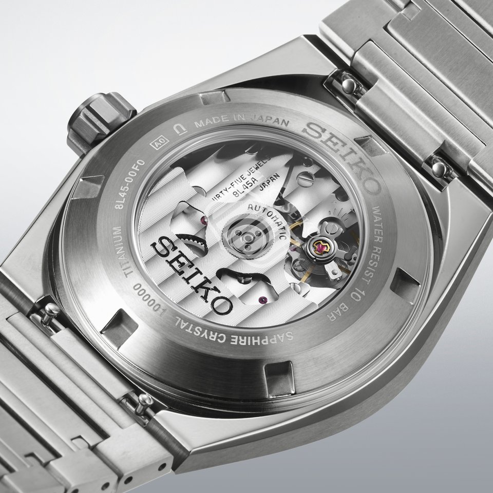 本作に搭載された「キャリバー8L45」は、セイコーの現行メカニカルムーブメントとして最も安定した精度(日差+10秒~-5秒)と、約72時間の長いパワーリザーブを併せ持ちます。さらに、ダイバーズウオッチにも搭載することができる堅牢性も備えています。また、機能だけではなく美観も追求しており、回転錘や受にあしらった美しい波目模様を裏ぶたから見ることができます。