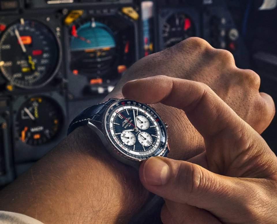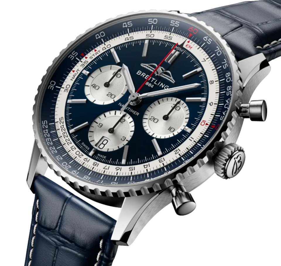 今日、ナビタイマーはその伝統を引き継いでいます。象徴である回転計算尺、バランスの取れたダイヤル、そして特徴的な刻み加工を施したベゼル。その意匠は航空黄金時代の精神を受け継ぎ、自らの航路を切り拓く人々に寄り添い続けています。