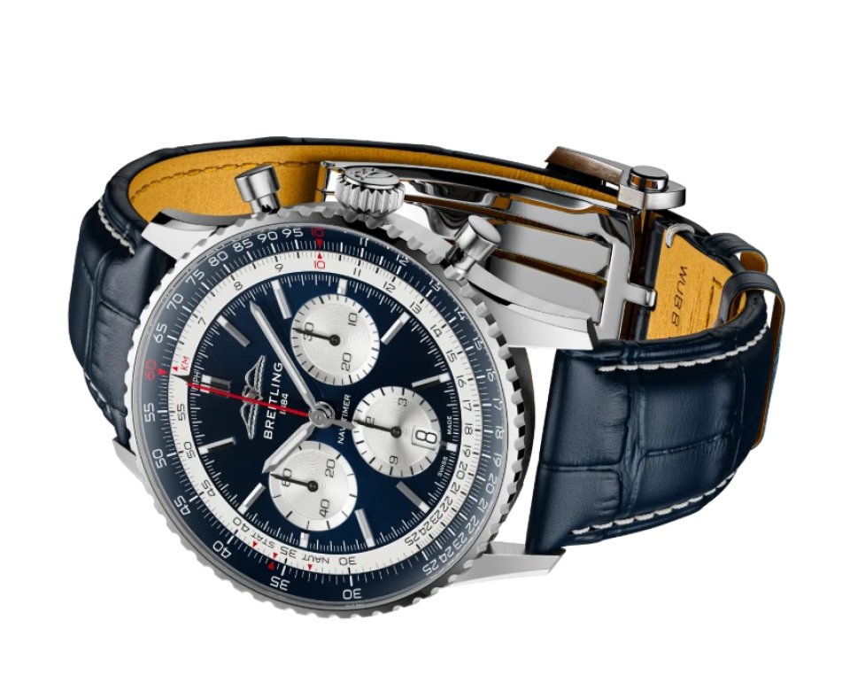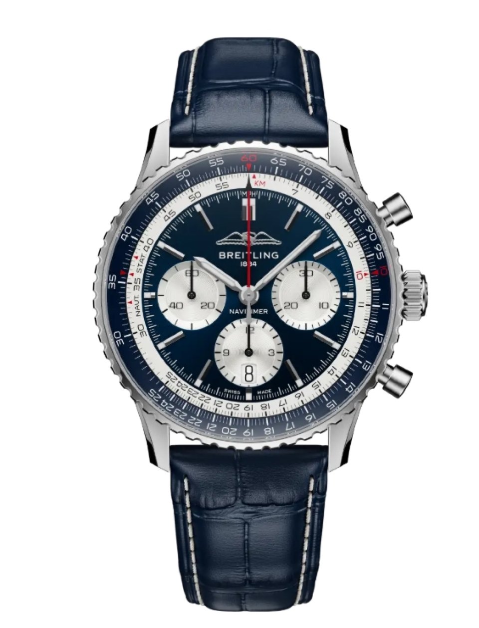 ナビタイマー B01 クロノグラフ 43 トリビュート トゥ コンコルドは、機上から見た成層圏の色合いに着想を得たブルーダイヤルと、同色のアリゲーターストラップを備えています。