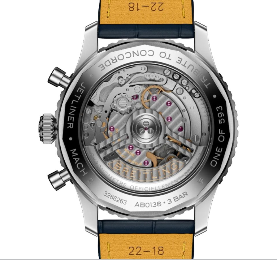 コントラストの効いたホワイトのサブダイヤルとインナースライドルールは、「白い鳥」を意味するコンコルドの愛称 L’Oiseau Blanc を想起させます。オリンパス593ターボジェットエンジンにちなみ、593本限定。ケースバックには「One of 593」「Tribute to Concorde」「Jetliner」「Mach 2」と刻印されています。