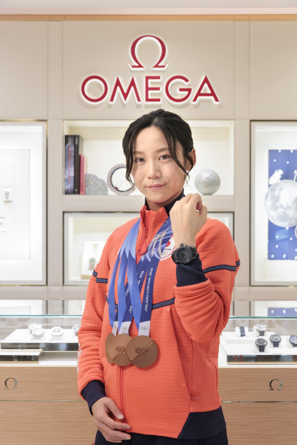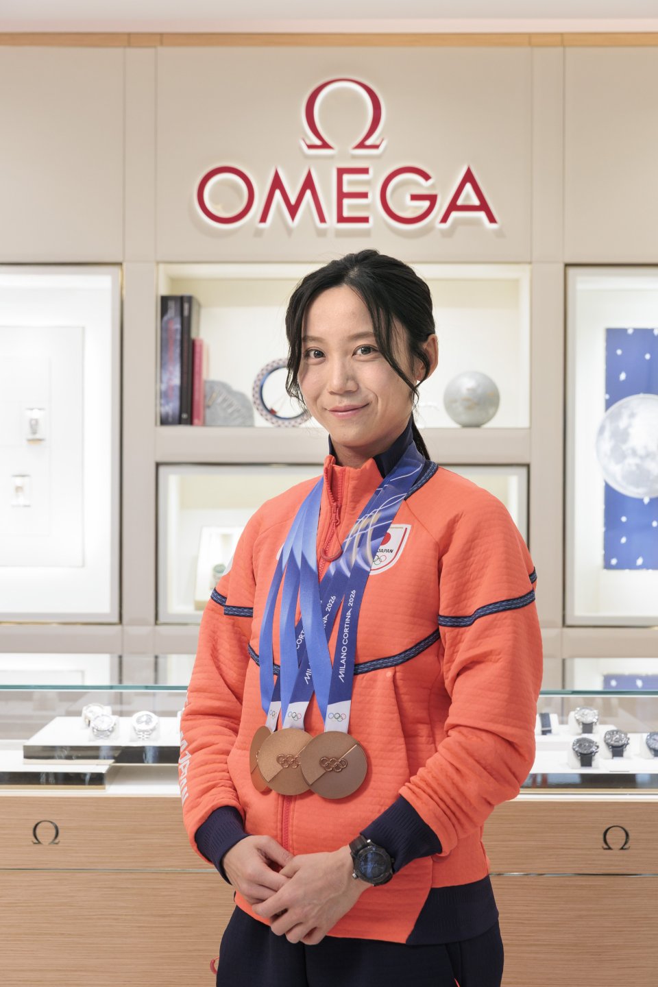 ミラノ・コルティナ2026において、髙木選手が女子1000m、女子500m、そして女子チーム パシュートにおいて見事獲得した3つの銅メダルは、まさに偉業と称すべき輝かしい功績です。 その重みは3つのメダルにも象徴されており、オメガは、これらのメダルとともに来場された髙木 選手の快挙を心より称え、祝福いたしました。