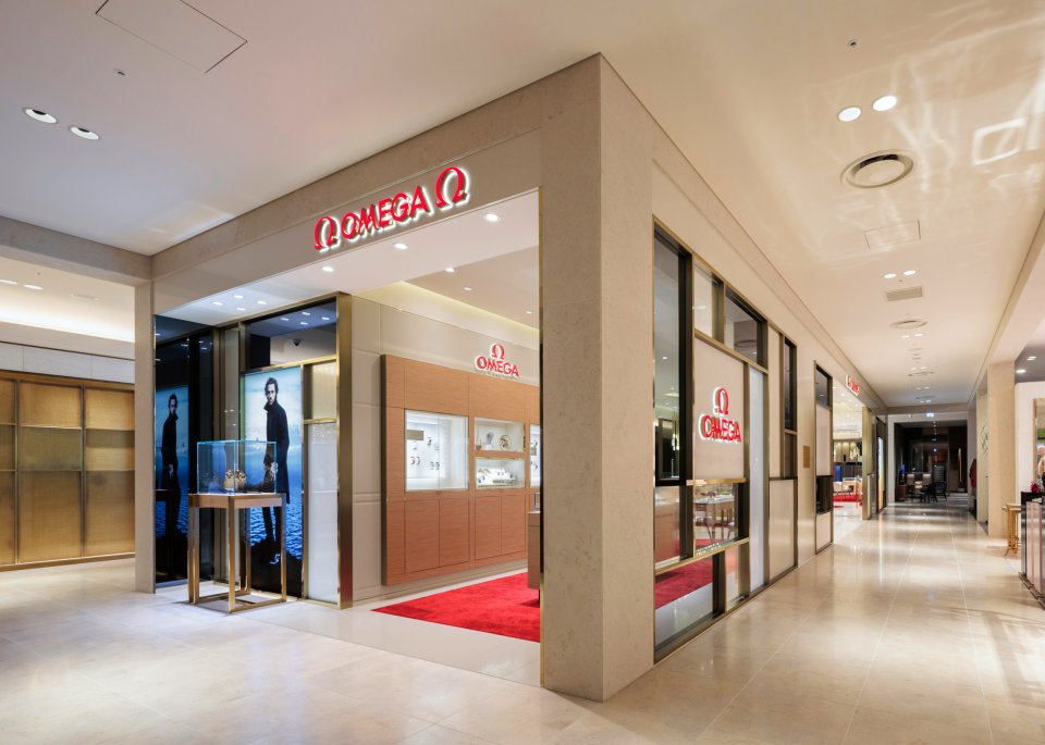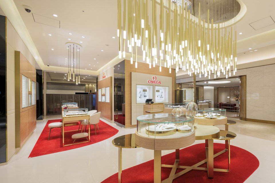 日本では初となる新しいコンセプトのモンドリアンウォールは、建築とアートが融合した象徴的なファサードとして、ブティックの存在感を際立たせます。ブティックの店内には、現代的なシャンデリアが訪れるお客様を包み込む光として機能し、店内の照明により各ショーケースに配置されたオメガのタイムピースが最も輝くよう設計されています。