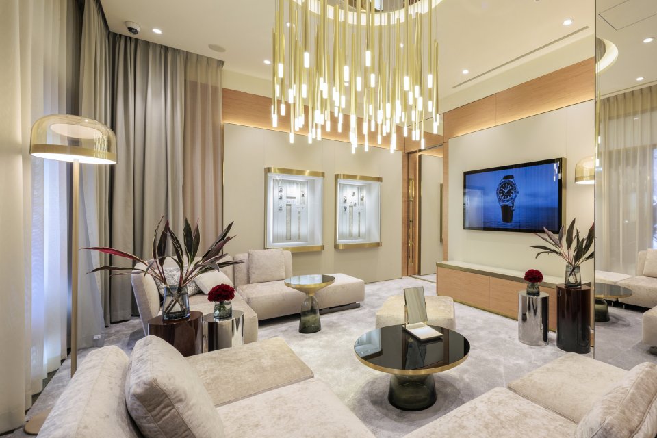 グレーカラーを基調としながらゴールドを随所にあしらい、モダンなシャンデリアが空間全体を洗練された光りで満たします。壁面にはオメガを象徴するビジュアルが設置され、スタイリッシュなウォールショーケースや、部屋全体をやわらかく照らす間接光など、ホテルのラウンジでおくつろぎいただくような気分で買い物をお楽しみいただけます。