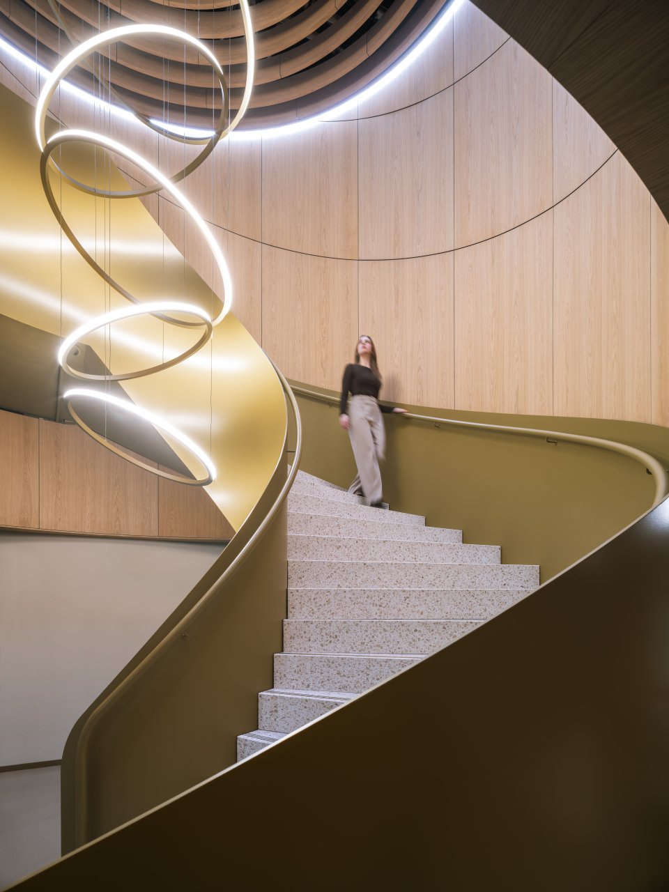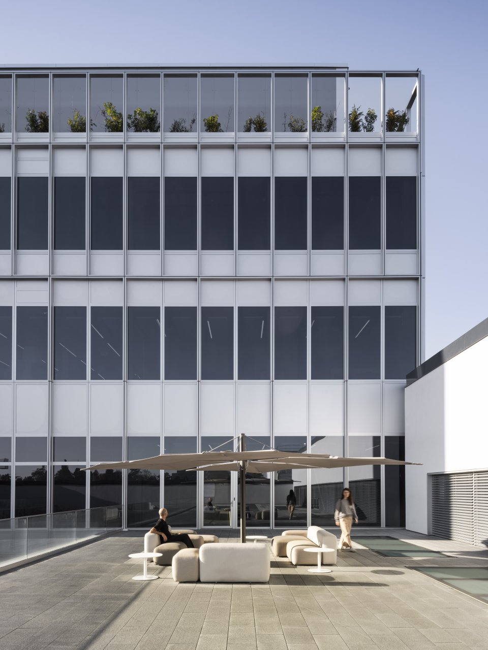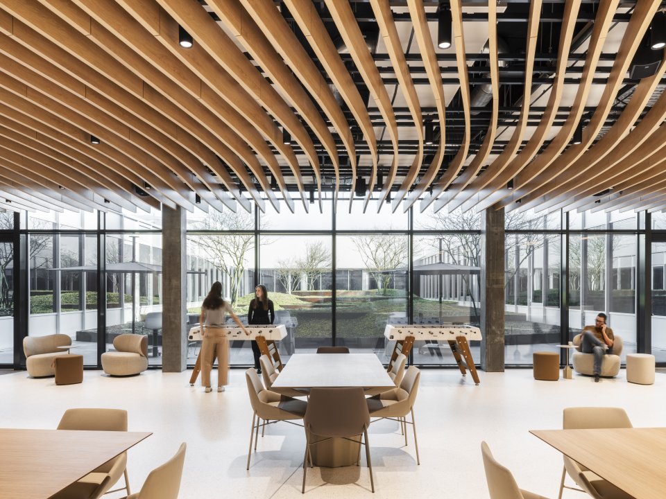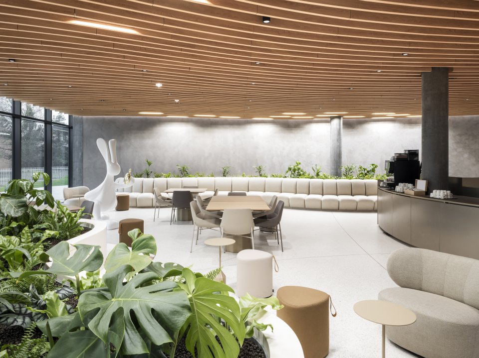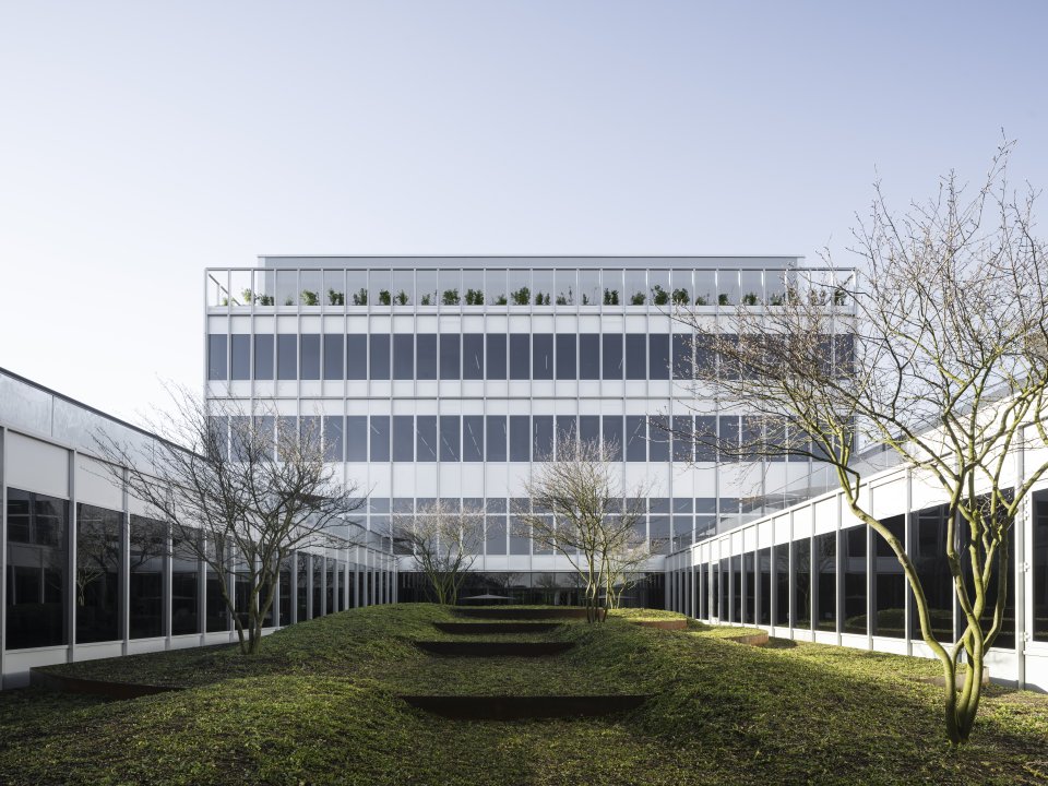 敷地の四角形の輪郭を反映するように、この新しいコンプレックスは「協働」「柔軟性」「ウェルビーイング」「最適化されたフロー」という4つの柱を理念としています。コミュニケーション、創造的シナジー、イノベーションの促進を目的に設計されており、オープンスペースや交流のための数多くのエリアが配置されています。また、協働スペース、集中作業向けの静かなゾーン、会議室、従来型オフィスなど、スタッフ一人ひとりが最適な環境を選べるよう、多様なワークスタイルに対応しています。