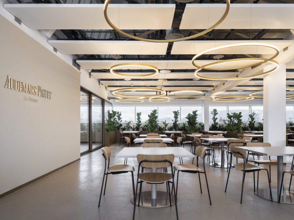 また、アクセスにおいても、持続可能なモビリティを促進する観点から設計されています。社員用駐車場を備える一方で、メイラン駅および発達した公共交通網に隣接している利便性も活かしています。これらの施策はスタッフのウェルビーイングを考慮して開発され、この新施設をオーデマピゲの協働と責任あるイノベーションを実現する製造サイトとするという本来の目的を強調しています。