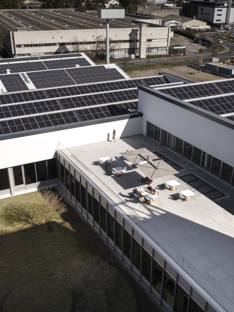 建物が消費するエネルギーの一部は、自社のソーラーパネルによってまかなわれています。すべてのオーデマ ピゲ拠点で導入されている基準に沿い、本建築は二つの認証を取得しています。歴史あるU字型の建物はMinergie Renovation認証を、新たに補完的に建設された構造物はMinergie-P-Eco認証をそれぞれ得ており、この施設はヘリテージに根差したアプローチと、最高水準の技術要件を満たすプロジェクトを融合させています。