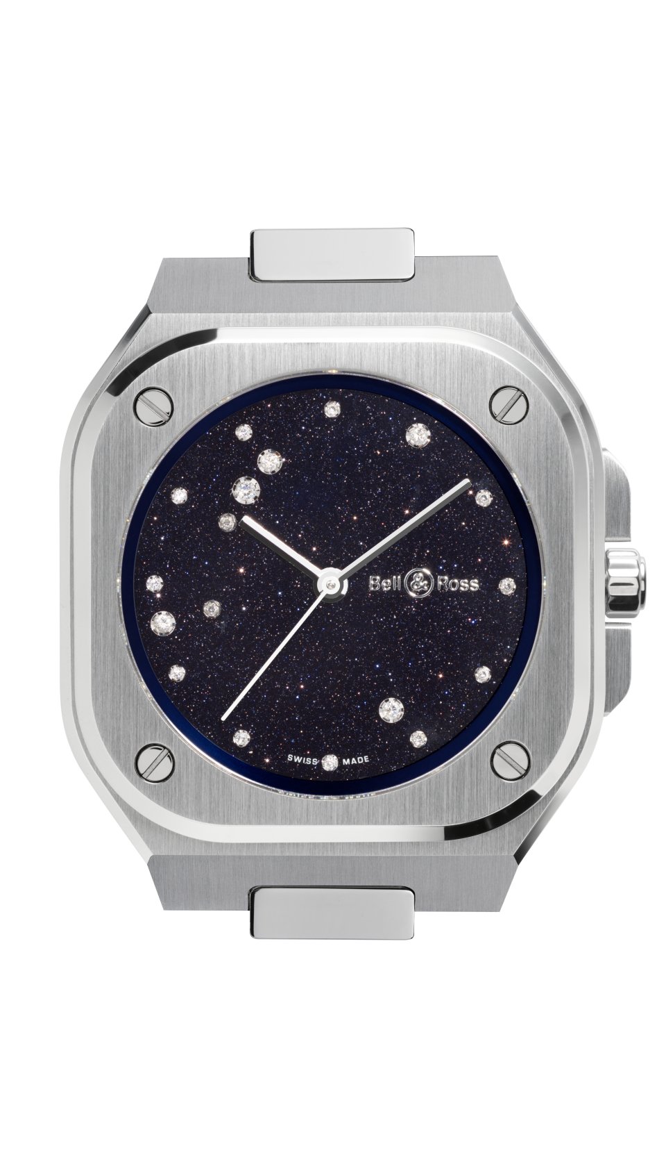 BR-05 36mm ブルー ダイヤモンド イーグルは、コンテンポラリーで洗練された存在として、力強いキャラクターと気品、そして夢想的な美しさを宿します。コントラストを巧みに操るBR-05コレクションの最新作は、スクエアケースが持つ幾何学的な厳密さと、イーグル(ワシ)座に着想を得たジュエリーのように繊細なラウンドダイヤルを組み合わせています。アベンチュリンダイヤルの星空を背景に、7つのダイヤモンドが、夏の夜空を堂々と舞うワシの雄大なシルエットを形づくる星々の位置を再現しています。