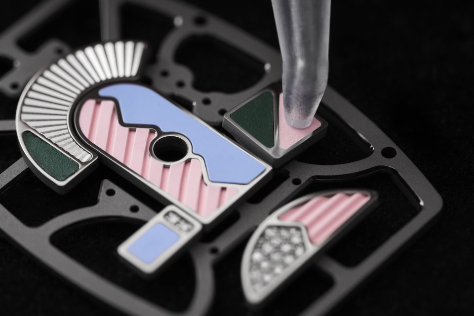 グレーのPVD加工を施したレッドゴールド製ダイヤルは、ミクロン単位まで精密に仕上げられたカラーセラミックスのディテール、レーザーカットされたラバーの装飾パーツ、そしてホワイトゴールドのインサート内に緻密に収められたダイヤモンドセッティングのパーツで構成されています。構築的なジオメトリーと表情豊かなアブストラクションが互いを引き立てる、この素材と質感の組み合わせに、さらにギヨシェ装飾が加わります。