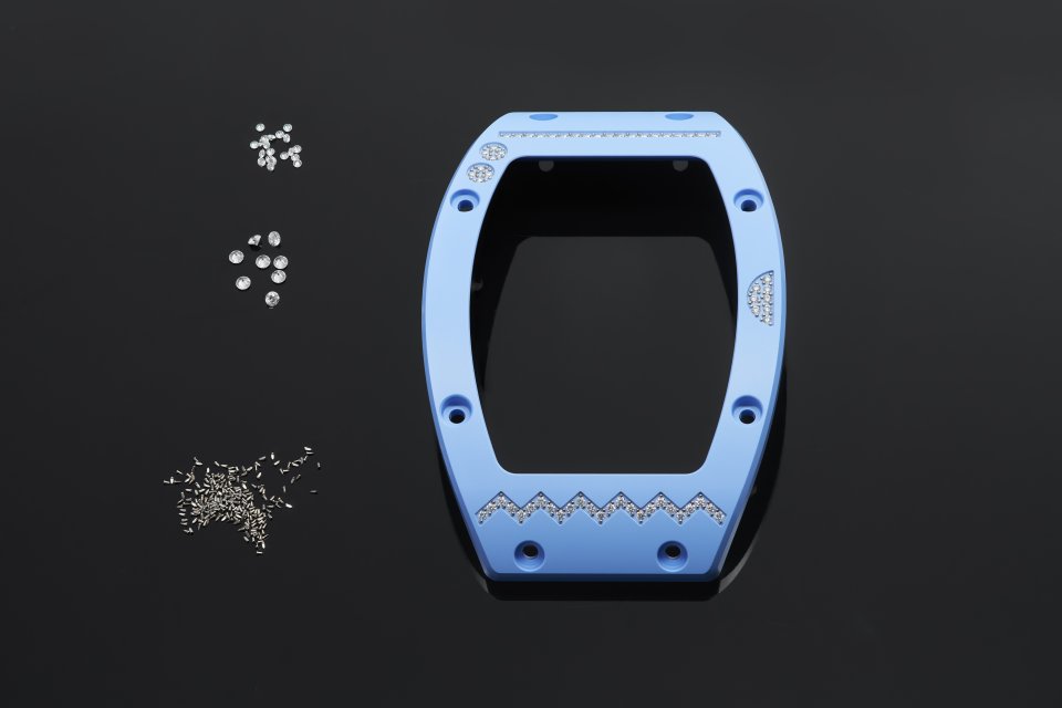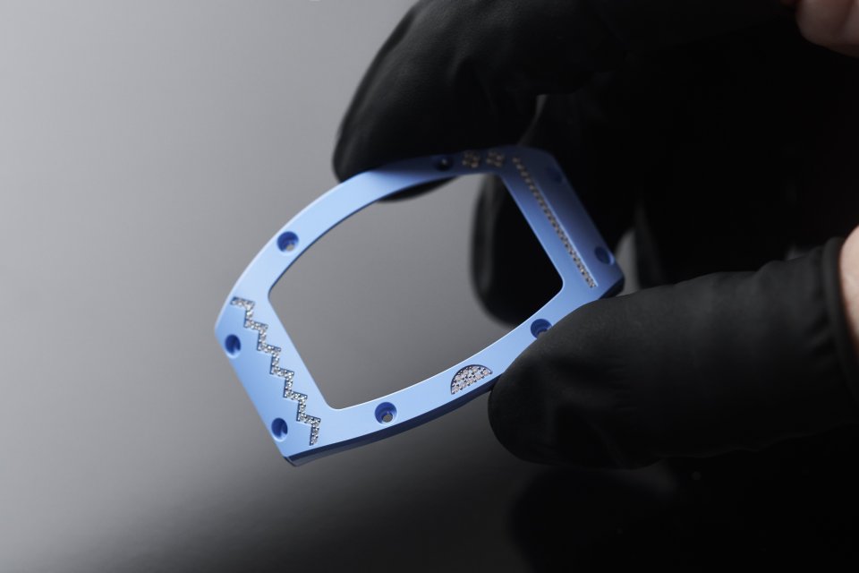 RM 07-01 ブラッシュピンク ではダイヤモンドに加え、イエローサファイアとブルーサファイアを、RM 07-01 パウダーブルー ではダイヤモンドにピンクサファイアとツァボライトを組み合わせています。