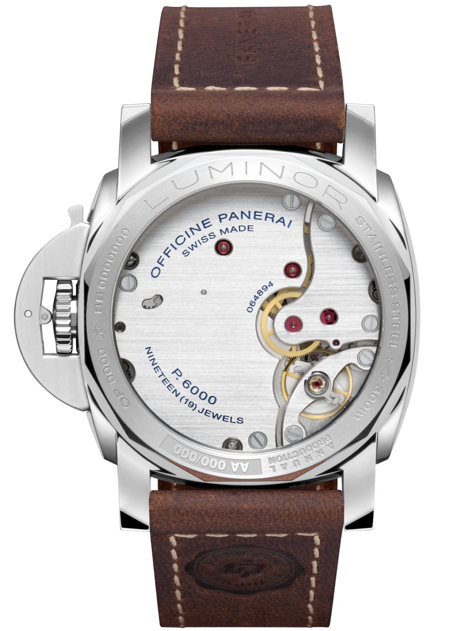 オープンケースバックを通して披露されるP.6000は、印象的なブルーの刻印と、プレート上の水平ヘアラインが特徴です。これらの新しいタイムピースにP.6000を組み込むことで、パネライは、初期の作品に普及していた手巻きムーブメントを想起させるだけでなく、時計製造の専門知識の基本的な側面として、手巻きムーブメントを追求し続けていることを示しています。