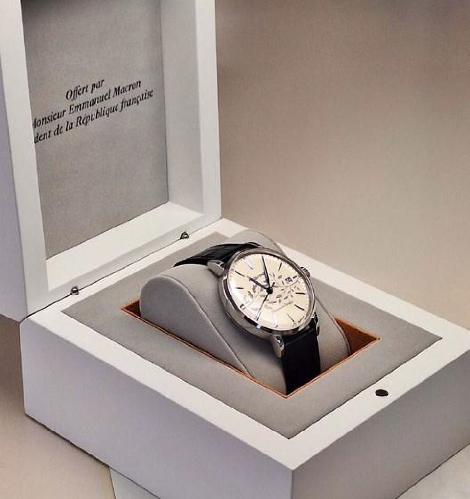 最後に、同じくブザンソンに拠点を置くフランス・エトゥイ社が、「アティテュード・インペリアル」専用の特注プレゼンテーションボックスを製作しました。白漆塗りの木材と淡いグレーのスエードにオレンジ色のアクセントを施したこのケースは、贈り物の貴重な性質を際立たせています。内部には「フランス共和国大統領 エマニュエル・マクロン氏より贈呈」という刻印が施され、この一連の品々を完成させています。