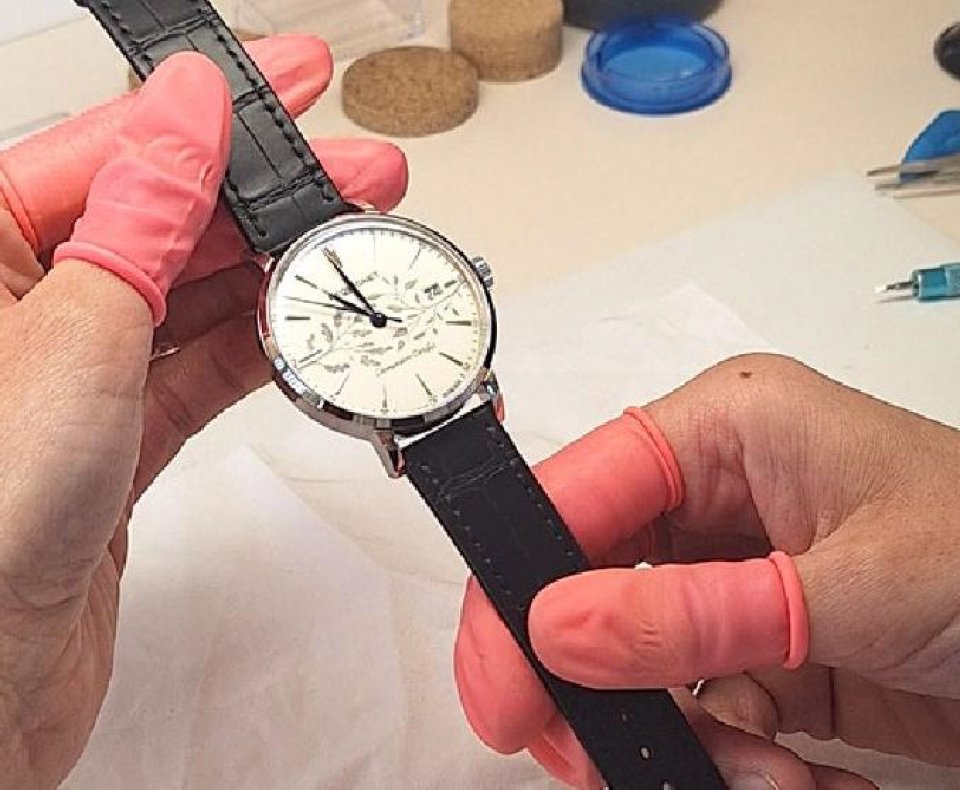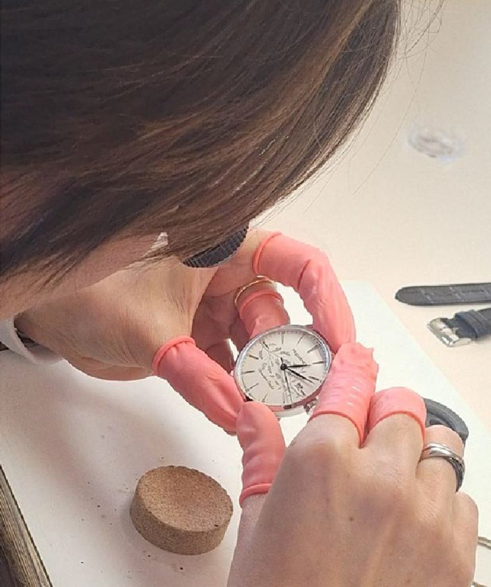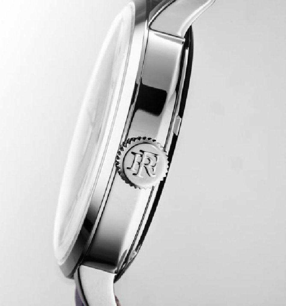 モルトーにある「ラ・プラティーク」の工房では、卓越した伝統の極みであるブルー・スチール製の針が製作されました。また、ブザンソンを拠点とするマニュファクチュール・ジャン・ルソーによって、この時計専用の特別なアリゲーターストラップがハンドステッチで仕上げられました。