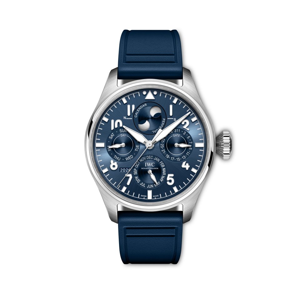 「ビッグ・パイロット・ウォッチ・パーペチュアル・カレンダー・プロセット“プティ・プランス”」(Ref. IW339601)は、直径43 mm、ホワイトの酸化ジルコニウム・セラミック製ケースと、グラデーション仕上げが施されたディープブルーの文字盤を備えています。文字盤の数字とイン デックスはホワイトでプリントが施され、ロジウムメッキの 針にはスーパールミノバ®がコーティングされています。 この時計に組み合わされるのは、EasX-CHANGE®システムを装備したホワイトのラバー・ストラップです。
