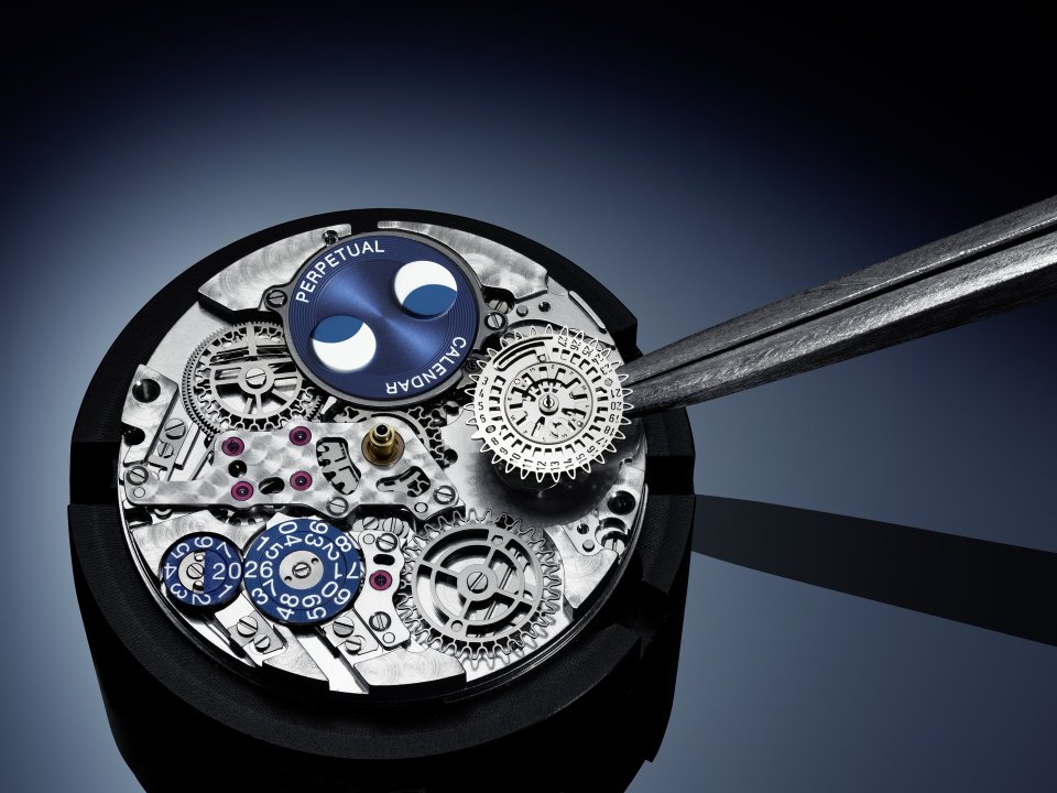 機械式ムーブメント、ペラトン自動巻き機構、日付・曜日・月・4桁の西暦を表示する永久カレンダーと永久