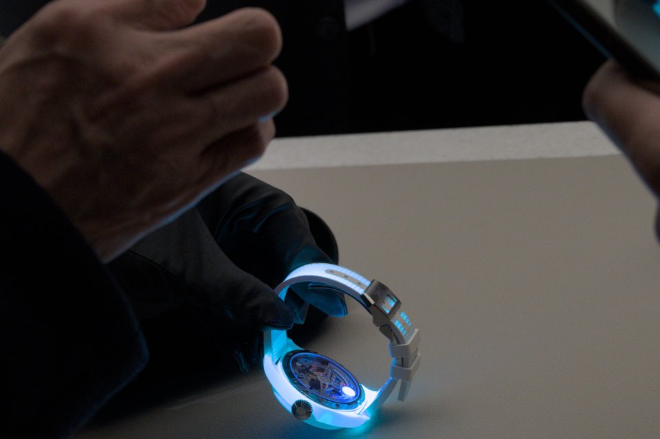 こちらばUVライトによる「チャージ」の様子、ケースだけではなく自動巻きローターやストラップにも顔料が加えられていることがわかります。