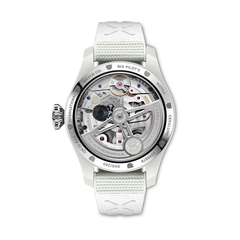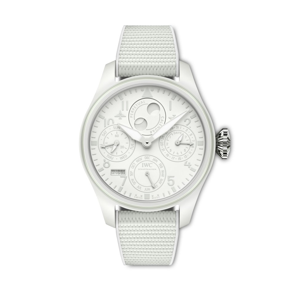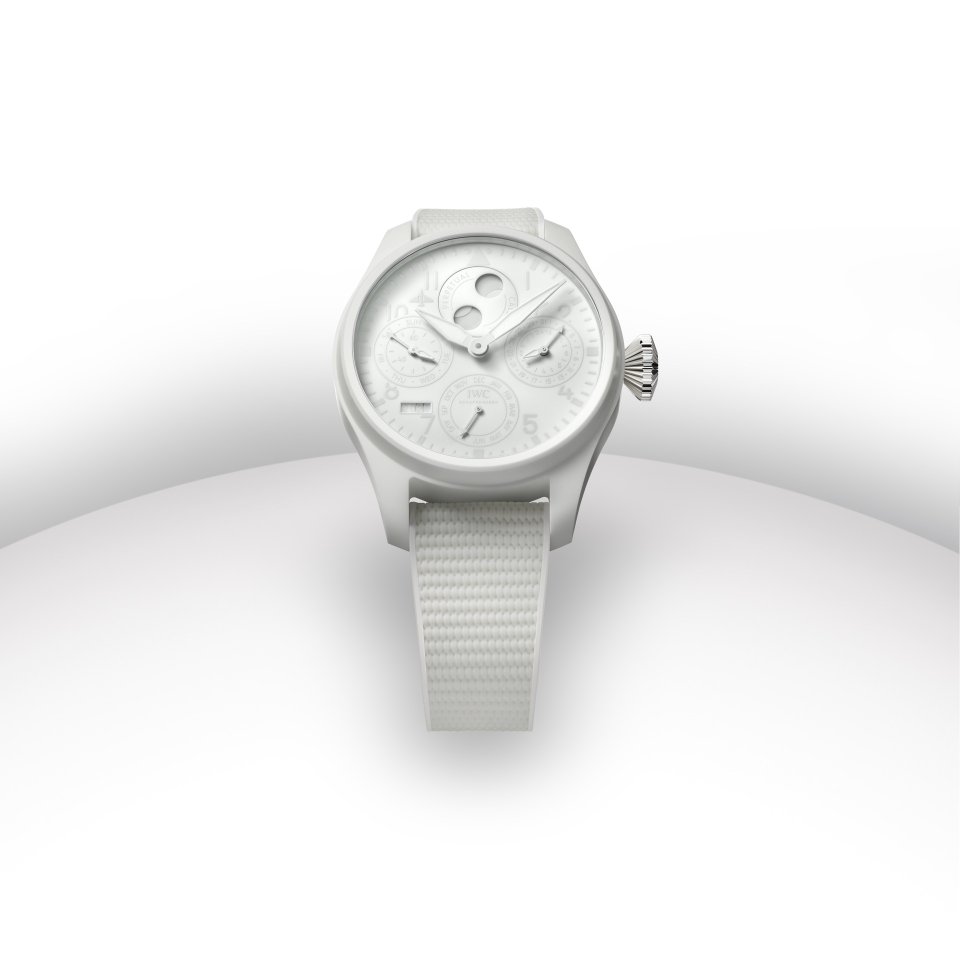250本限定生産の「ビッグ・パイロット・ウォッチ・パーペチュアル・カレンダー・セラリューム®」(Ref. IW505801) は、発光ホワイト・セラミック製の46.5 mmのケースを備えています。セラリューム®ケースには、スーパールミノバ®が コーティングされたホワイトの発光文字盤とホワイトの ラバー・ストラップが組み合わされます。文字盤上のインデックスと数字は異なるホワイトの色調でプリントされ、グレーの針は発光素材でコーティングされているのですが、これにより、「ビッグ・パイロット・ウォッチ・パーペチュアル・カレンダー・セラリューム®」は、全く異なる2つの表情を持つ時計となっています。日光の下では、ホワイトとグレーのさまざまな色調と、光沢のある面とマットな面の質感の違いをお愉しみいただけます。暗所では、印象を変化させ、 ケース、文字盤、ストラップは青みがかった強い輝きを放ち、数字と針は輝く文字盤に黒のコントラストとして現れます。
