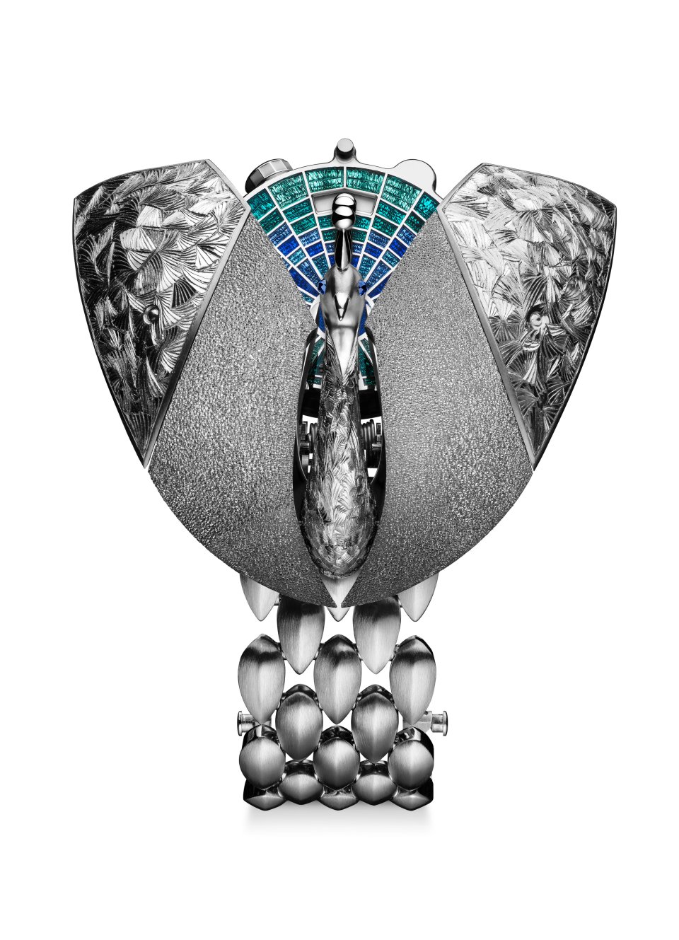 「エタブリスール ピーコック」はシークレットウォッチへのオマージュです。時計が閉じた状態では、美しいエングレービングを施したホワイトゴールドのかぶと虫のように見えますが、ワンプッシュすると羽根と頭が開き、ハンドクラフトのミニチュアの孔雀が現れます。そして繊細なハンドエングレービングを施した半透明なエナメルダイヤルが羽根の間に現れ、孔雀の尾となり、その名の通り華やかさを持つタイムピースです。ジュエラー、エナメル職人、エングレーバー、時計師らがそれぞれの技を持ち寄り、このタイムピースを完成させました。孔雀の目にはカラーストーンがセットされ、さらなる洗練を添えています。3種類のバリエーションが 2027年に登場する予定です。