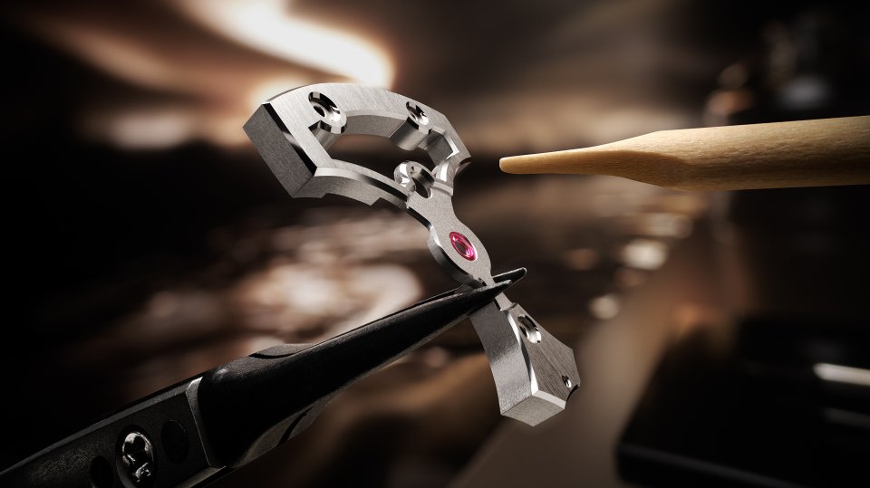 ポリッシュ仕上げを施し、背面からジャイロトゥールビヨン・ストラトスフェアを支えるステンレススチール製ブリッジのデザインは、ジャガー・ルクルトが 1946年に発表した画期的な懐中時計用トゥールビヨンのトゥールビヨンブリッジに着想を得たものです。このブリッジ、そして時・分表示受けを支えるブリッジには、非常に高い耐久性のある素材が必要なため、ゴールドではなくステンレススチールが選ばれました。