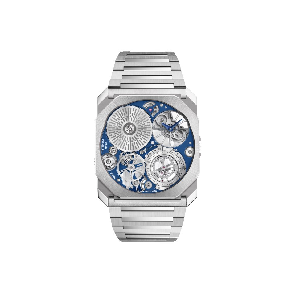 「オクト フィニッシモ ウルトラ トゥールビヨン プラチナ」は、スケルトンのダイアルに印象的なブルーを配しています。限定10本という希少性だけでなく、ガルバニック処理が施されたメインプレート、ステンレススティール製のラチェットホイール、サテンブラッシュおよびポリッシュ仕上げを組み合わせたブレスレットなど、審美眼を持つコレクターの注目を集めるのにふさわしいディテールが随所に見られます。