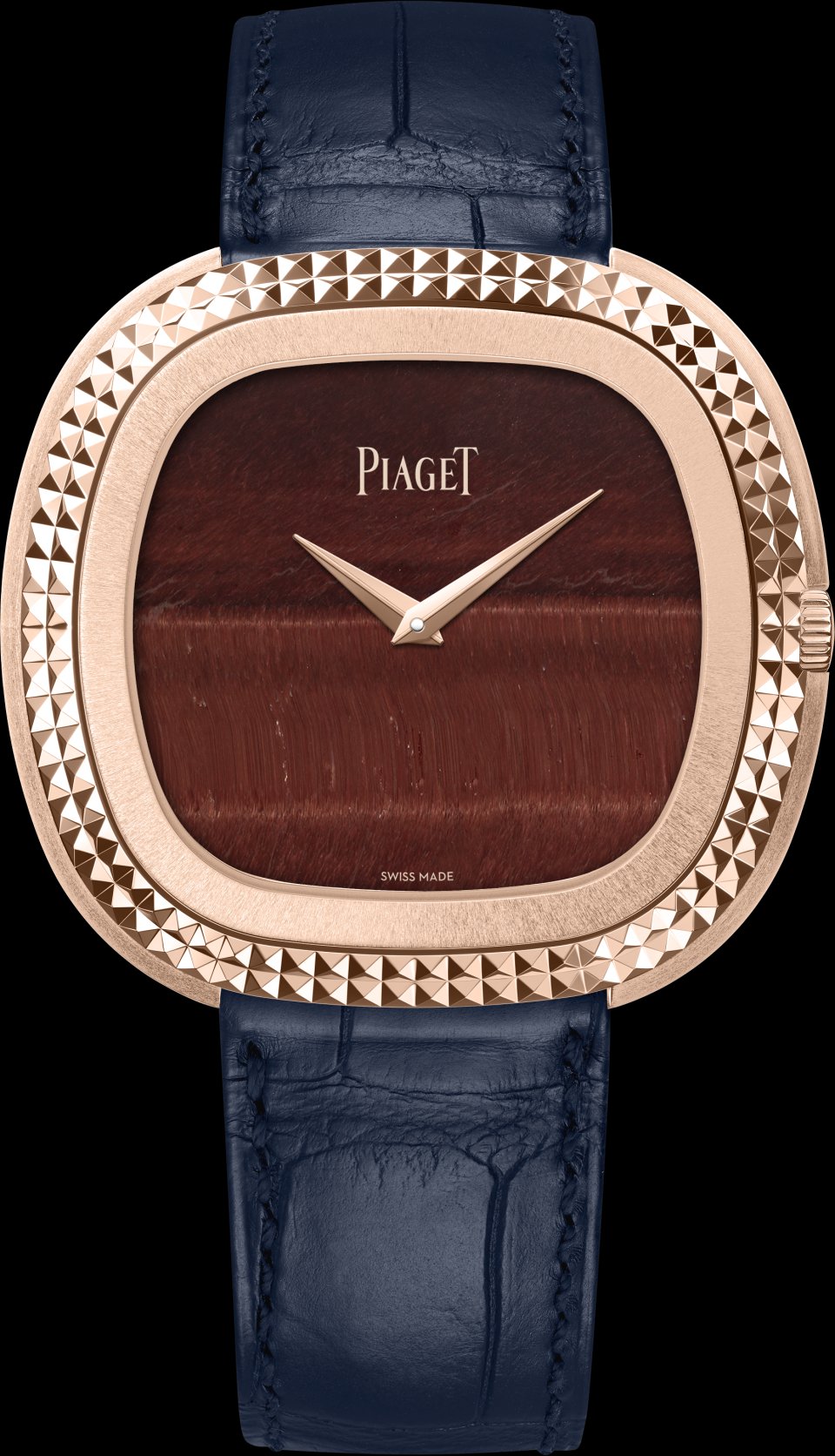 今日、ピアジェの色彩の芸術は、メゾンの歴史とつながる3つの印象的な色彩設計を通して輝きを放っています。ピアジェのシグネチャーカラーへのオマージュであるブルーの色合いが、ストラップ付きSixtie、ピンクゴールド製Piaget Polo 36mm、またはブルークォーツ文字盤を備えたAndy Warholウォッチを彩っています。一方、コレクターの間で人気の高いもうひとつのAndy Warholモデルに選んだ文字盤とケースは、温かみのある赤みがかったブラウンのブルズアイ、きらめくシャトヤンシー効果、スタッズの映えるクル・ド・パリケースです。ホワイトゴールドバージョンは、2024年に発売されています。