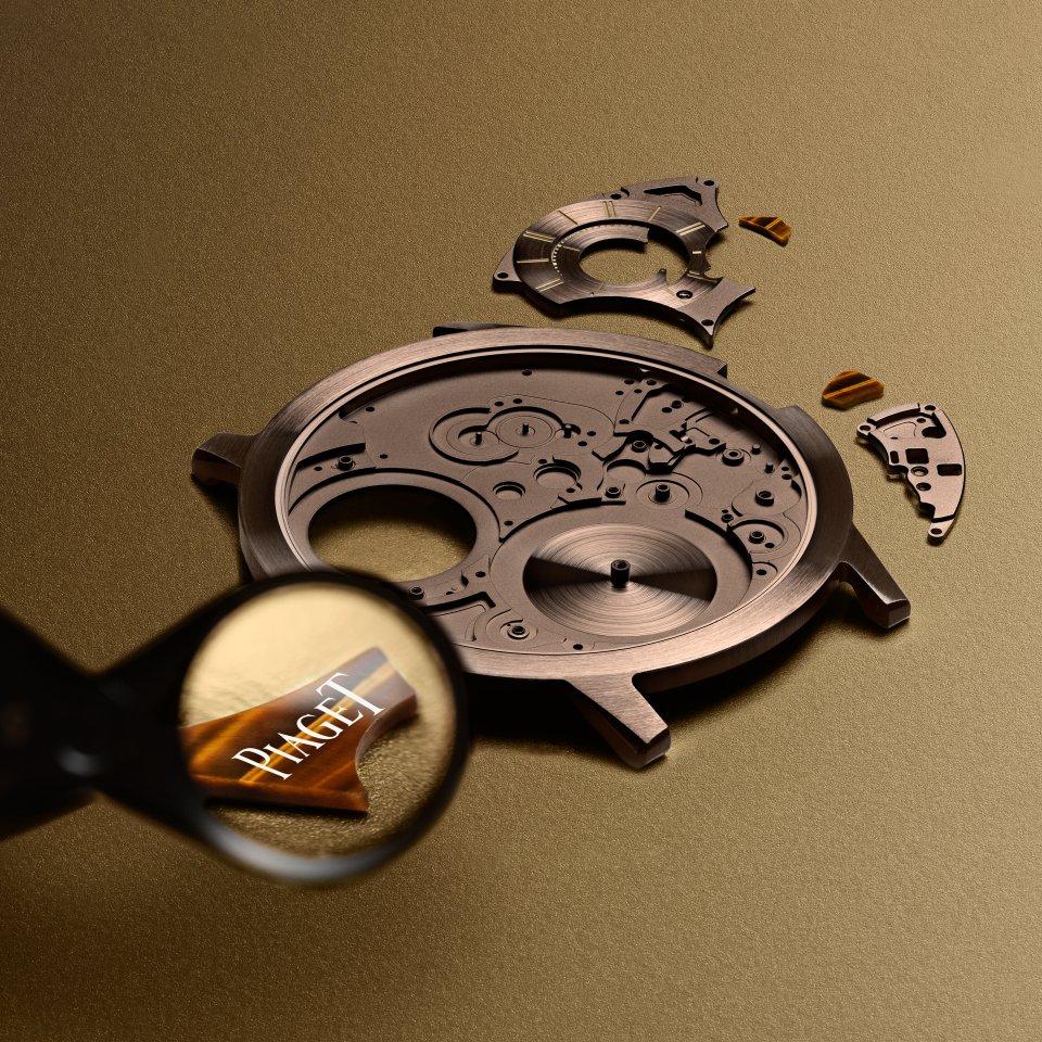 それ以来、ピアジェの色彩の芸術は、オーナメンタルストーンのカット、スライス、研磨の熟練技術とともに勢いを増し続けています。ストーンを要求される薄さ(0.4mmまで)と形状精度にカットし、光沢のある輝きに磨き上げて、個々の模様を際立たせるには、材料と技術に対する並外れたスキルと熟知が必要です。この工程には、破断の危険が伴い、破損のリスクが高くなります。